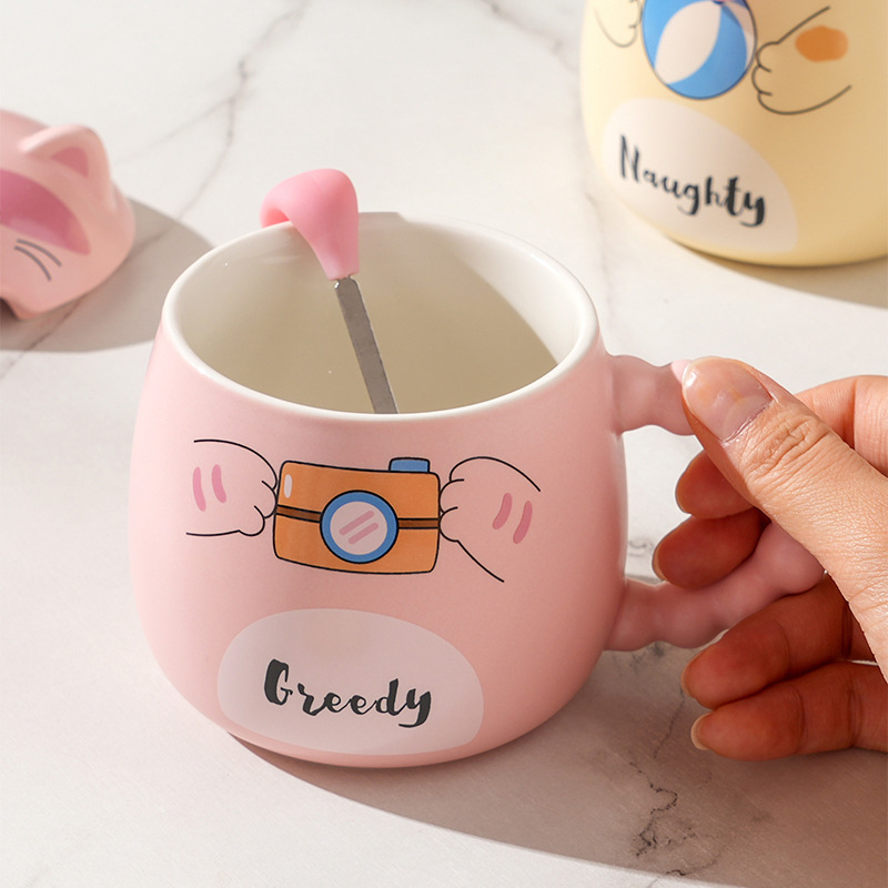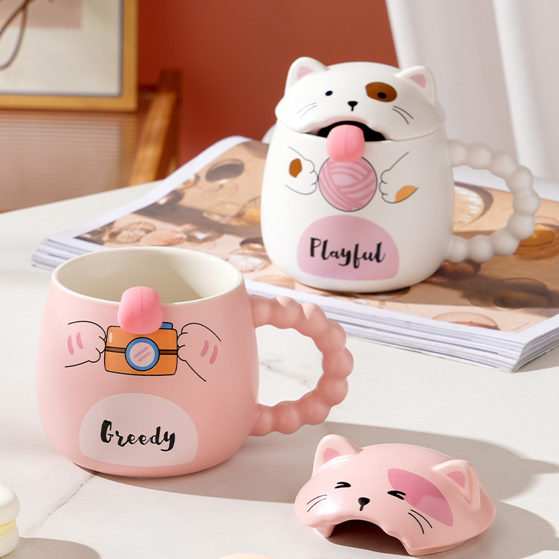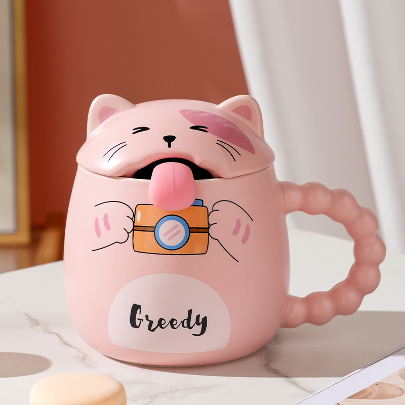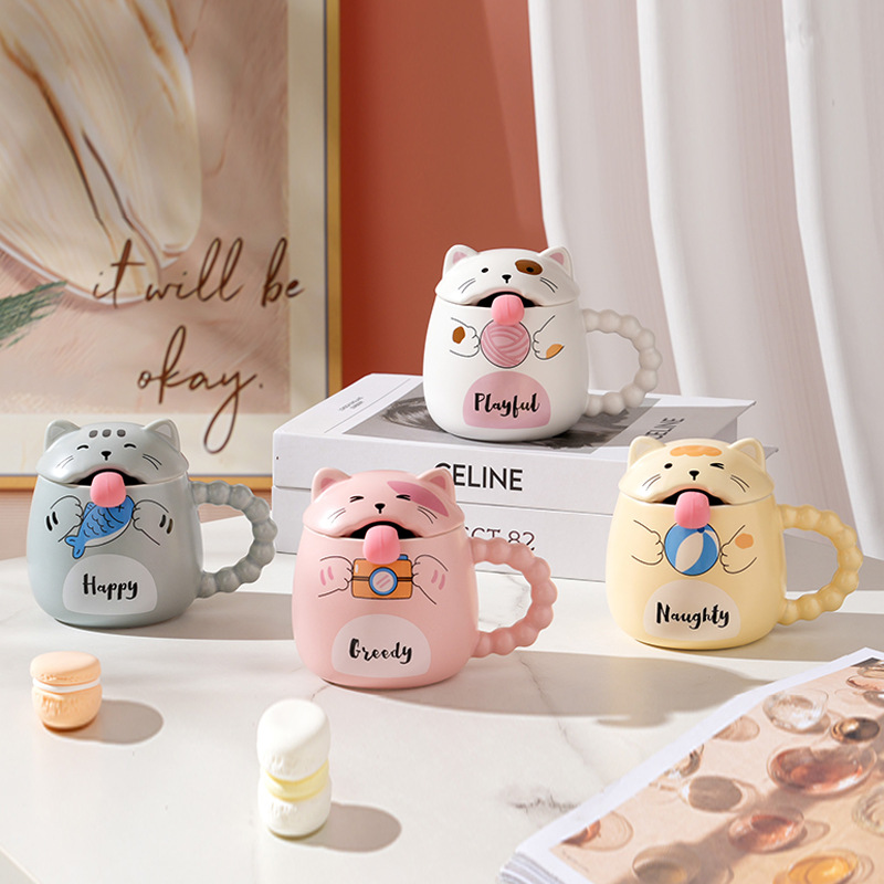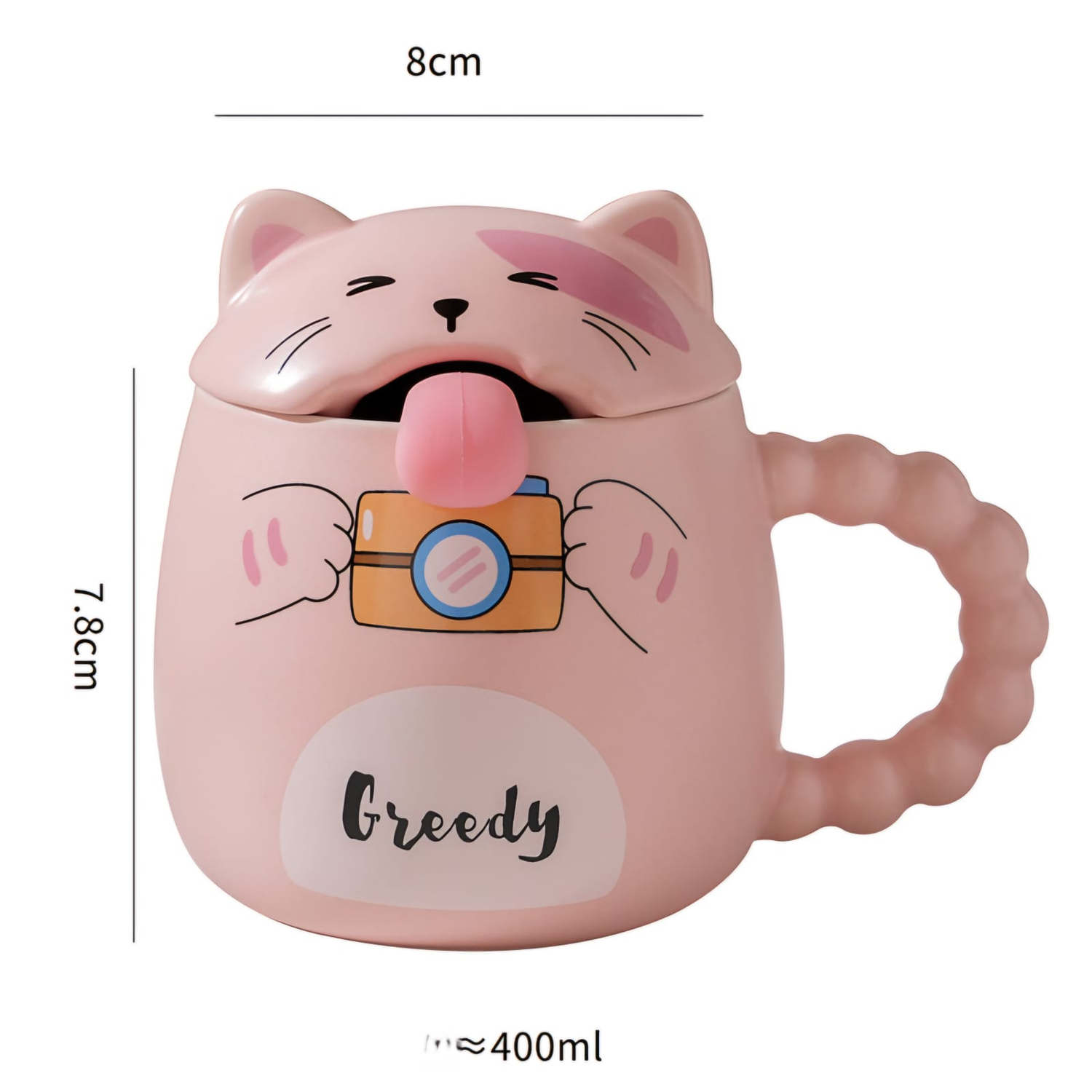 (Taza con un divertido diseño de gatito sacando la lengua, viene con cuchara y tapa. Material de alta calidad hecha de porcelana).