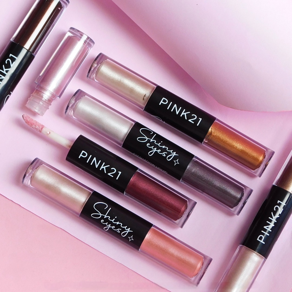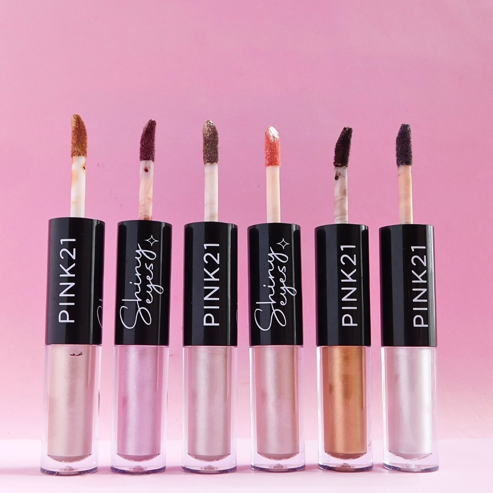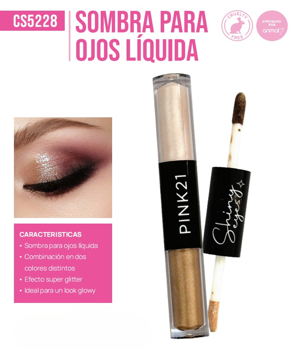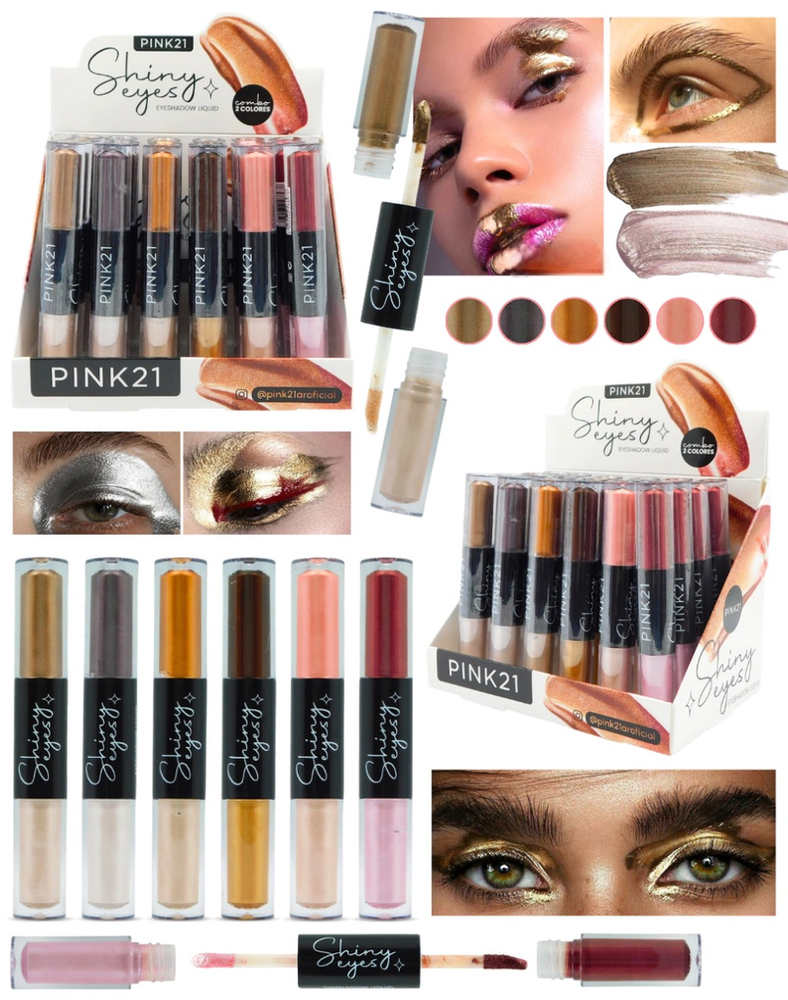 (Sombra liquida Shiny eyes marca "Pink 21". Vienen 6 modelos diferentes a elección y cada una trae 2 colores en total. Posee un efecto metálico y glitter para un brillo intenso. Ideal para resaltar la belleza de tus ojos).