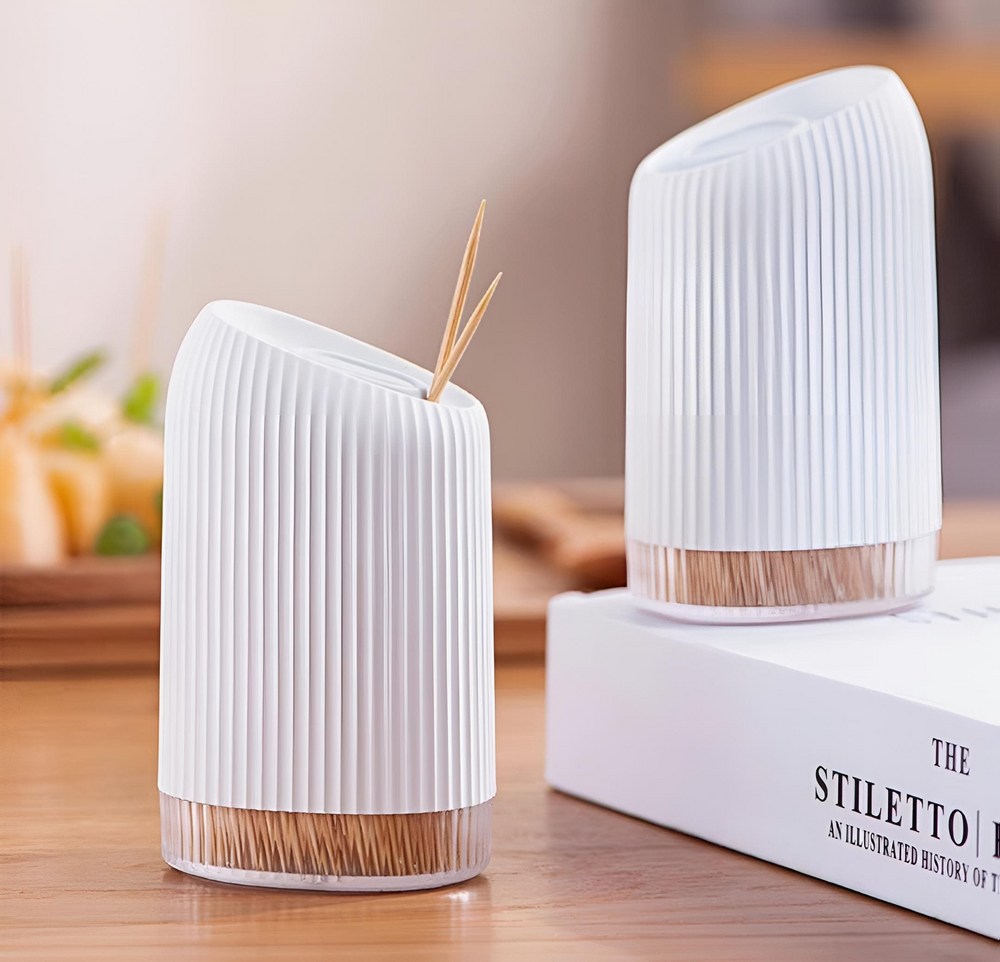 (Contenedor de escarbadientes con diseño minimalista. Tiene un dispensador de palillos. Además, la base y un orificio es traslúcido permitiendo ver el interior. Ideal para picadas, sándwiches y higiene El producto trae escarbadientes).