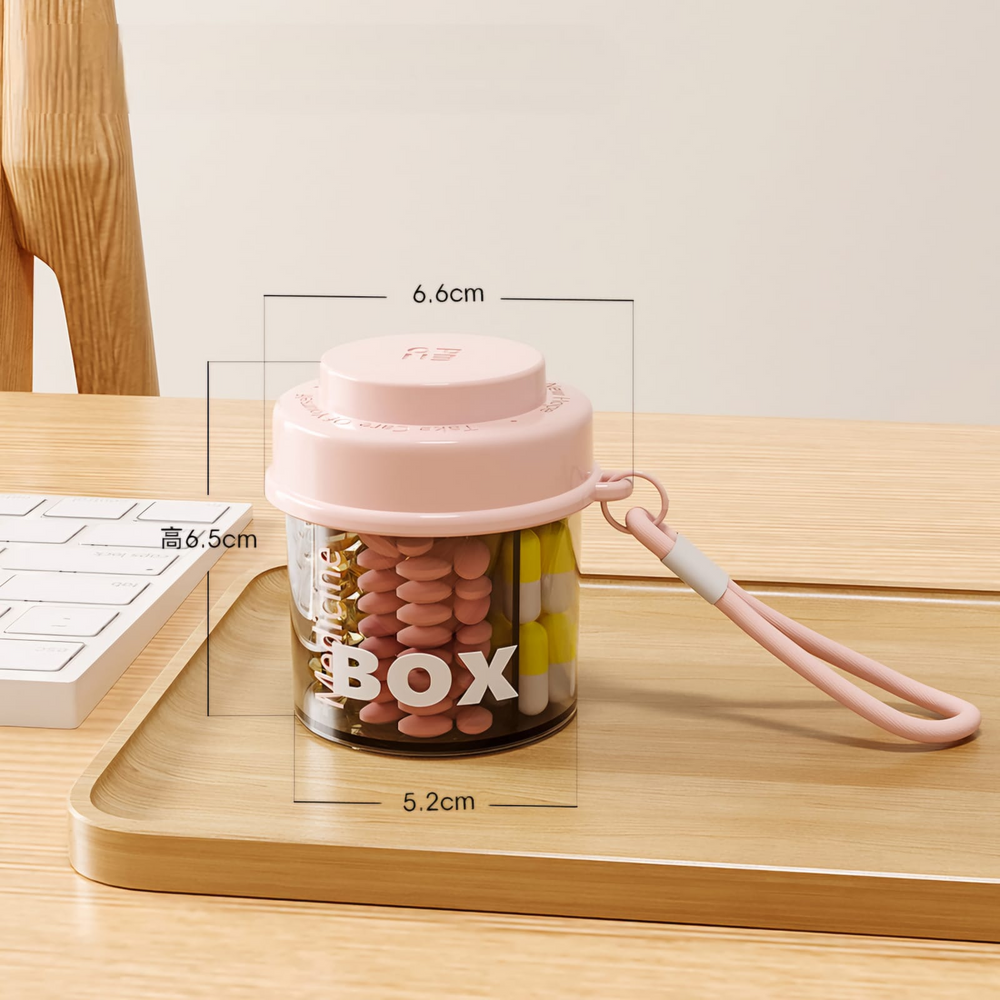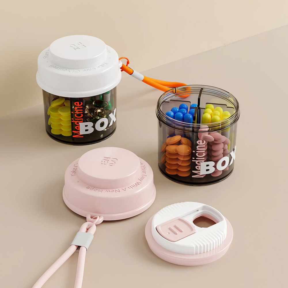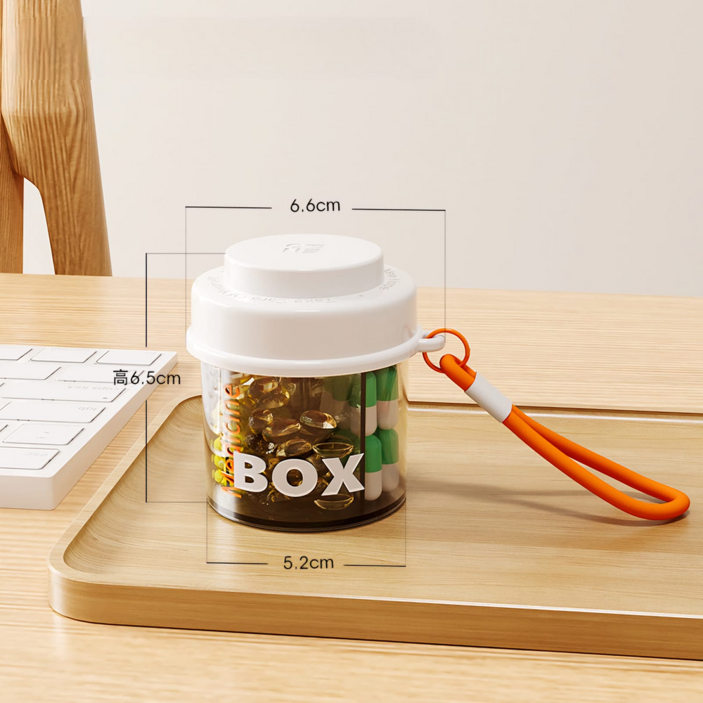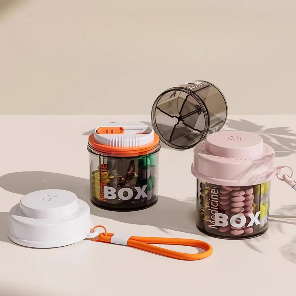 (frasco organizador de pastillas giratorio, cuenta con 4 divisiones , trae una correa de silicona para mayor facilidad de traslado).