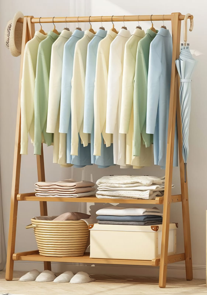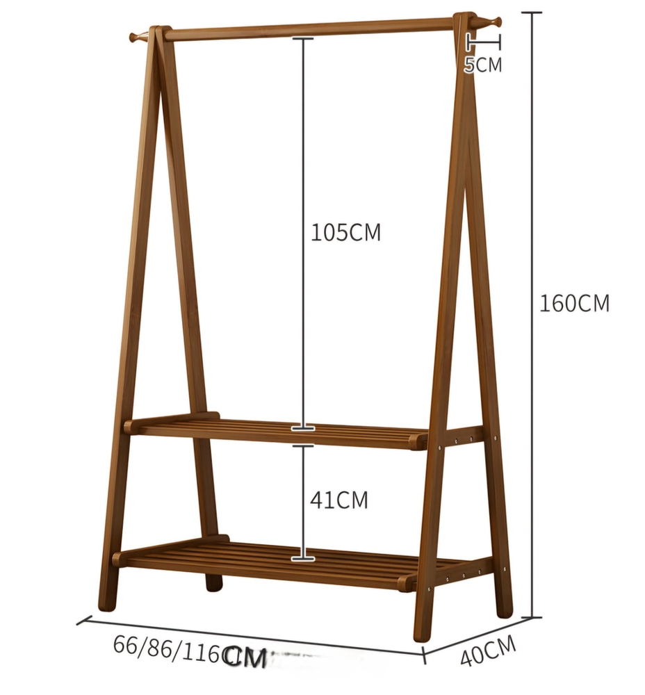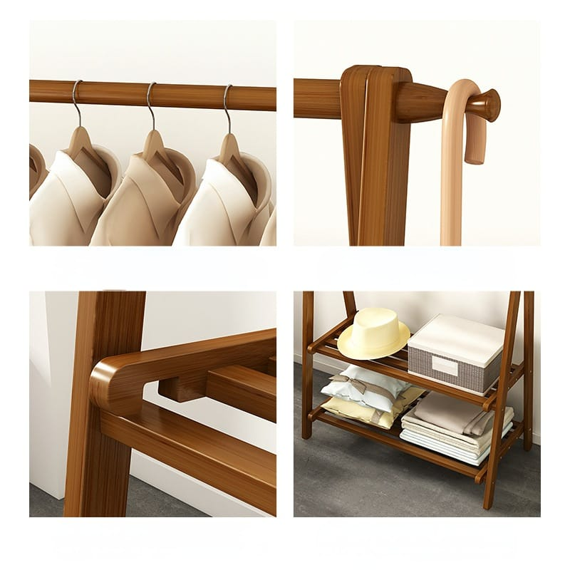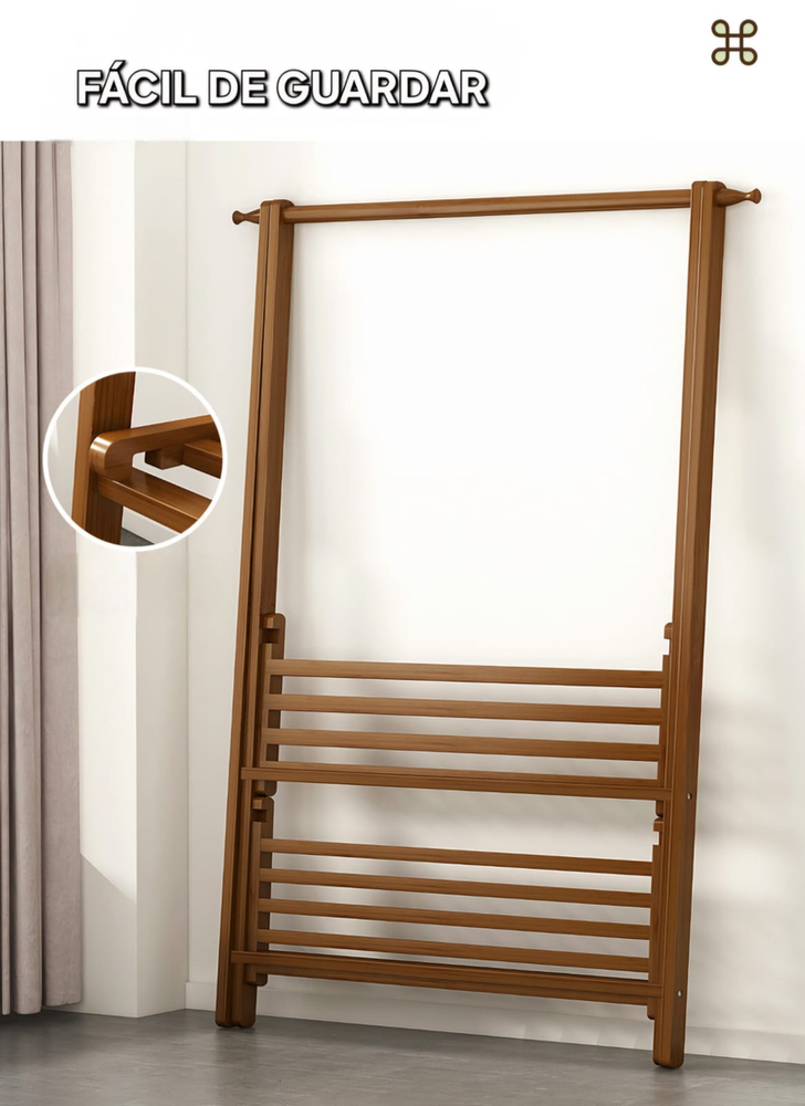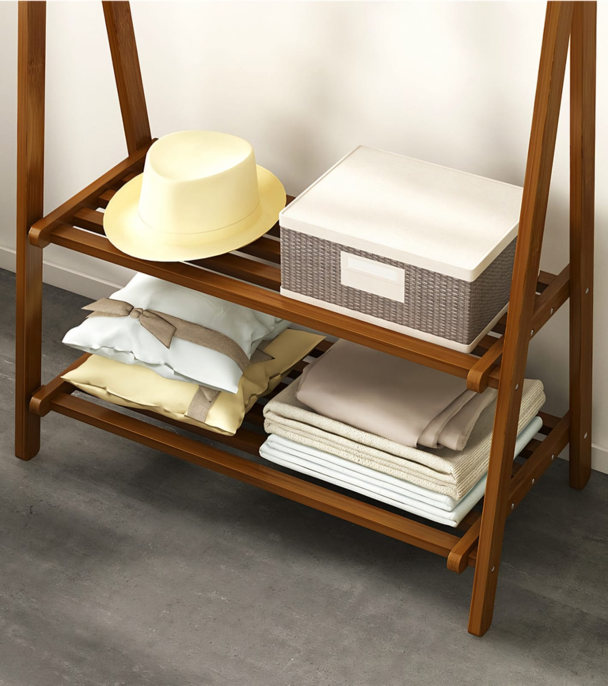 (Este perchero de bambú color marrón claro, cuenta con una barra en el superior para colgar y dos estantes en la parte inferior. Trae un guantes para un trabajo mas seguro a la hora de armar. Material resistente y super fácil de armar).