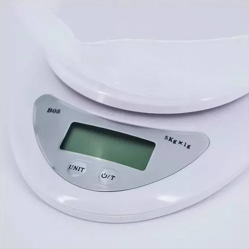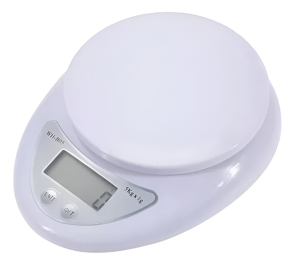 (Balanza para cocina, color blanca con detalles en gris, con una capacidad de medición de aguantar 5kg. Cuenta con una bandejita medidora, equipado con sistema de alta precisión).