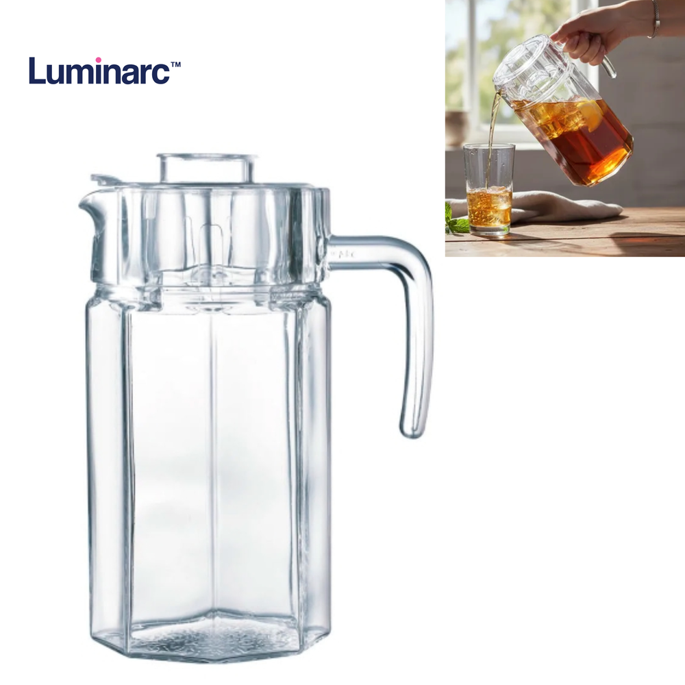 ( Está hecha de vidrio templado, lo que garantiza su durabilidad y resistencia. La tapa de acrílico incluida asegura que tus bebidas se mantengan frescas y protegidas, es perfecta para servir bebidas frías en reuniones familiares o eventos).