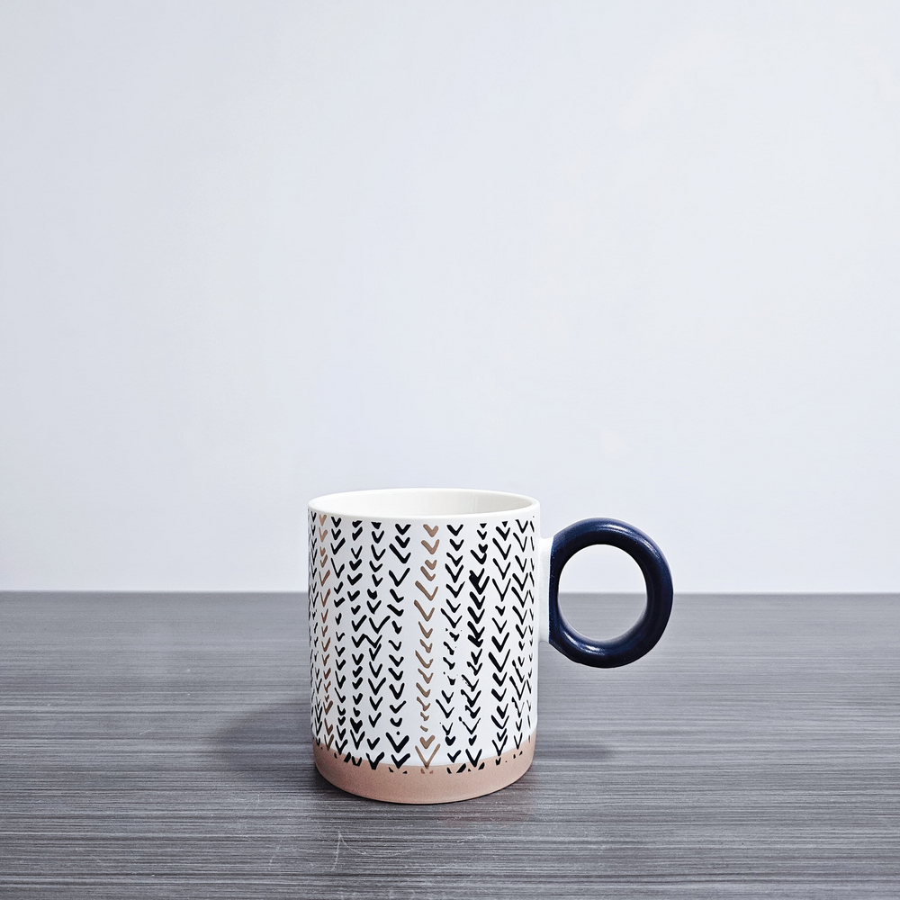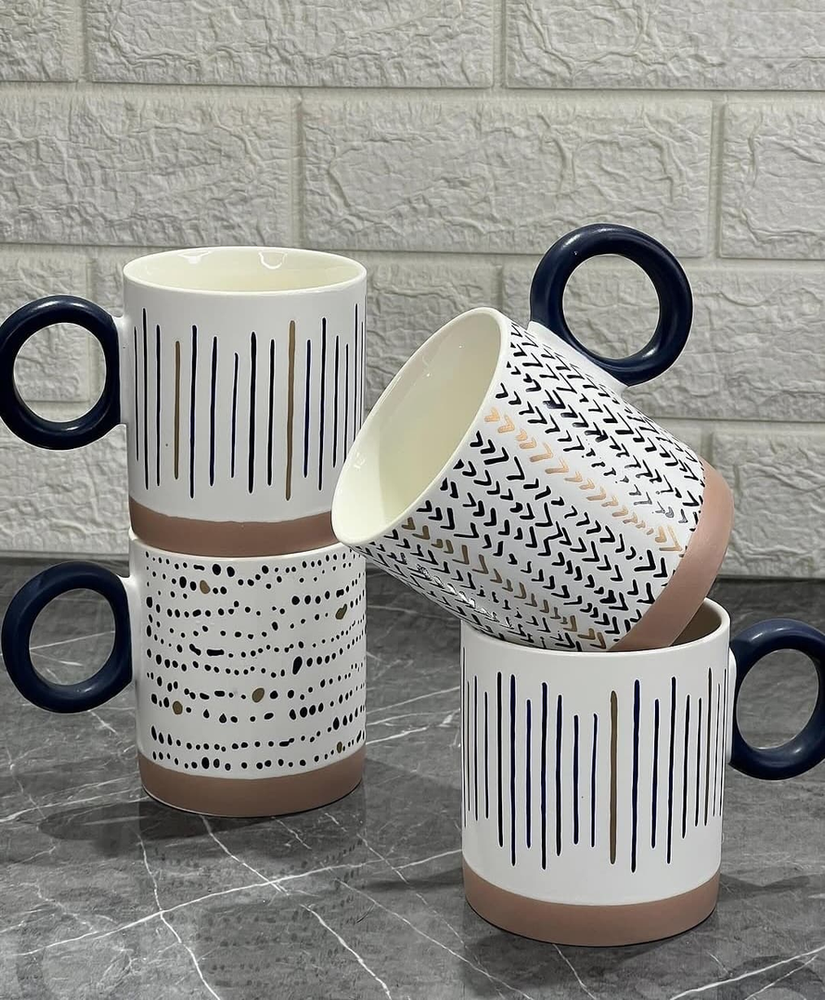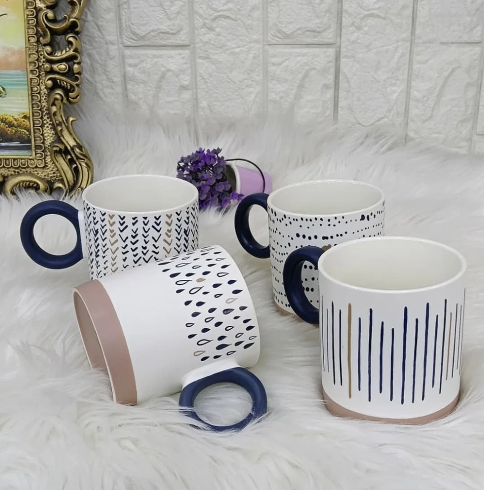 (Taza de cerámica blanca con asa azul, cada una con un diseño diferente. Ideal para darle un toque moderno a tu cocina ).