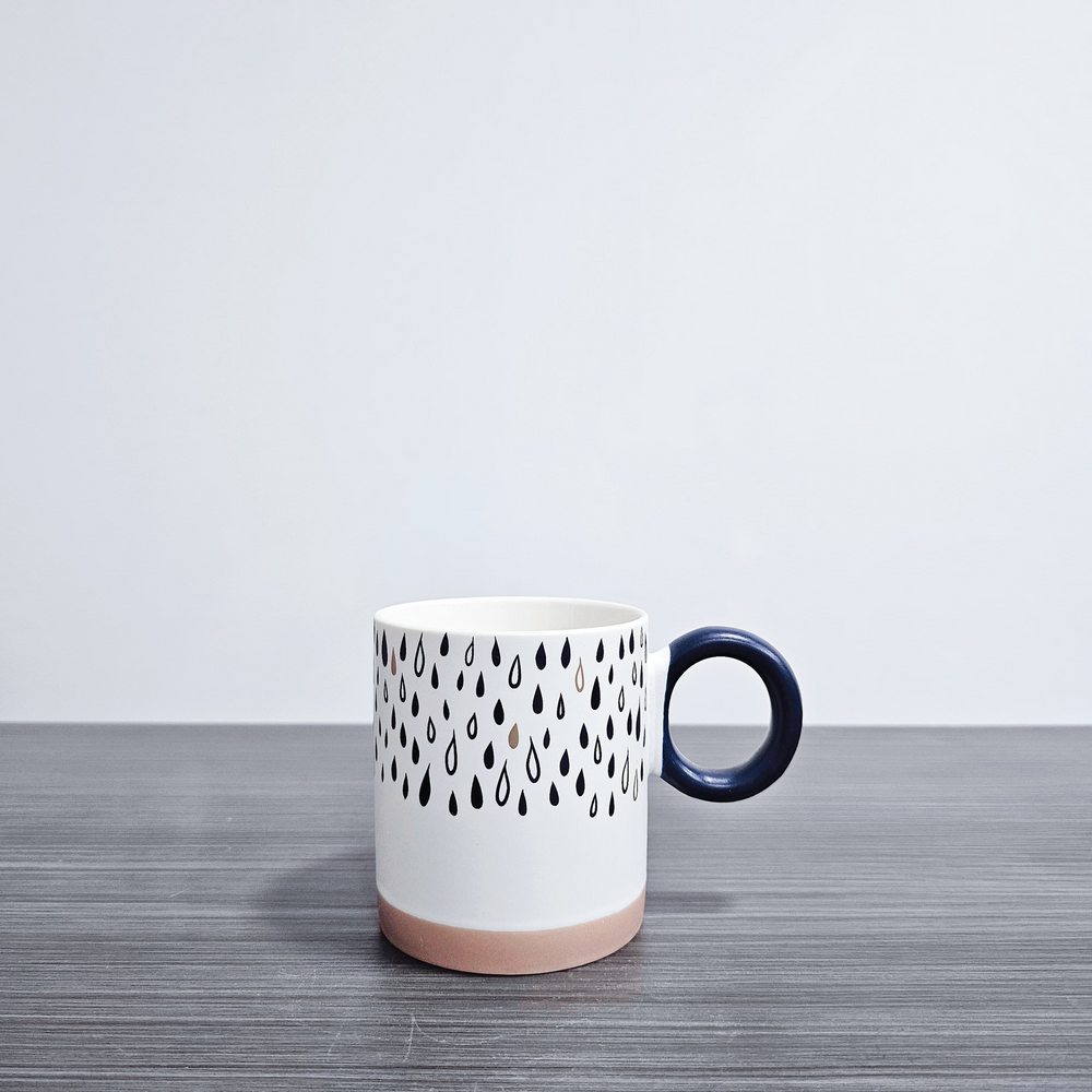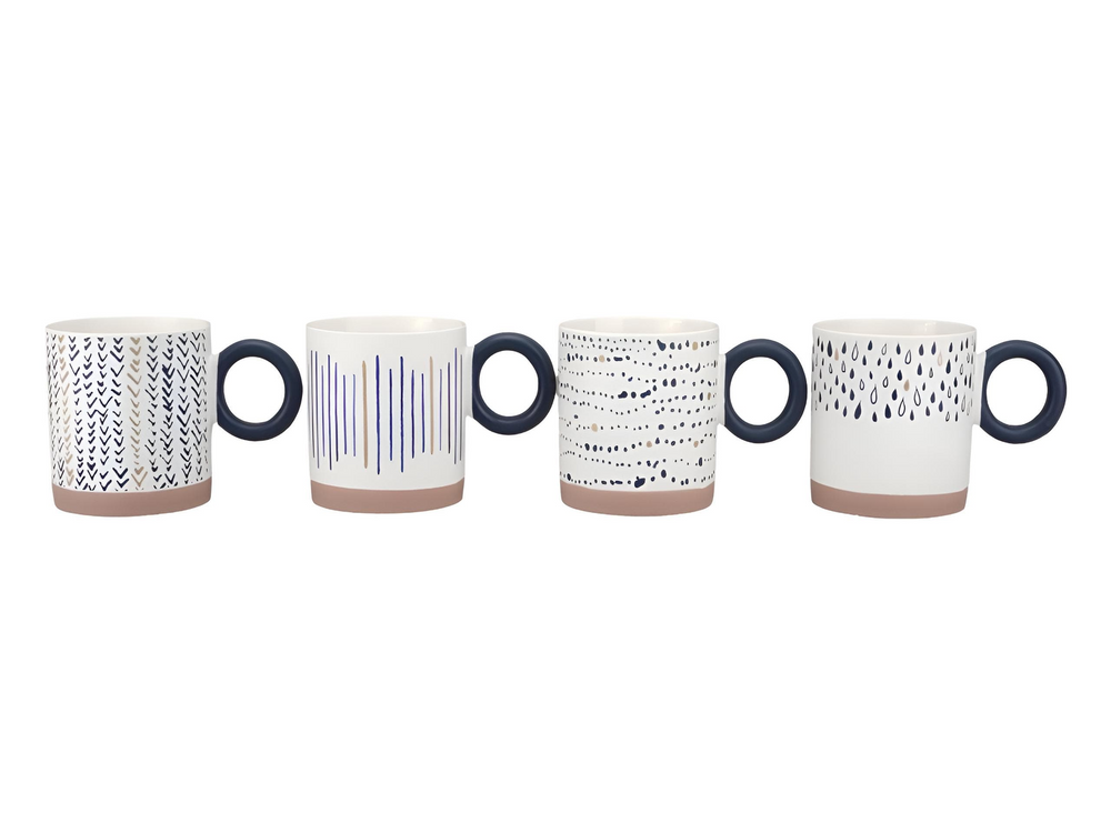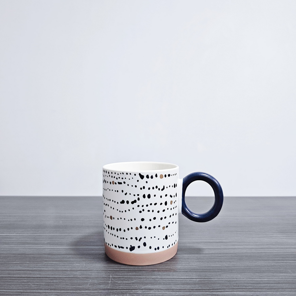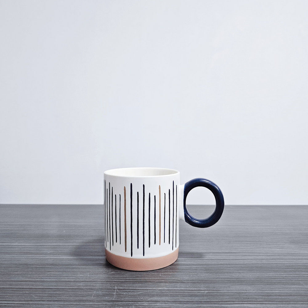 (Taza de cerámica blanca con asa azul, cada una con un diseño diferente. Ideal para darle un toque moderno a tu cocina ).