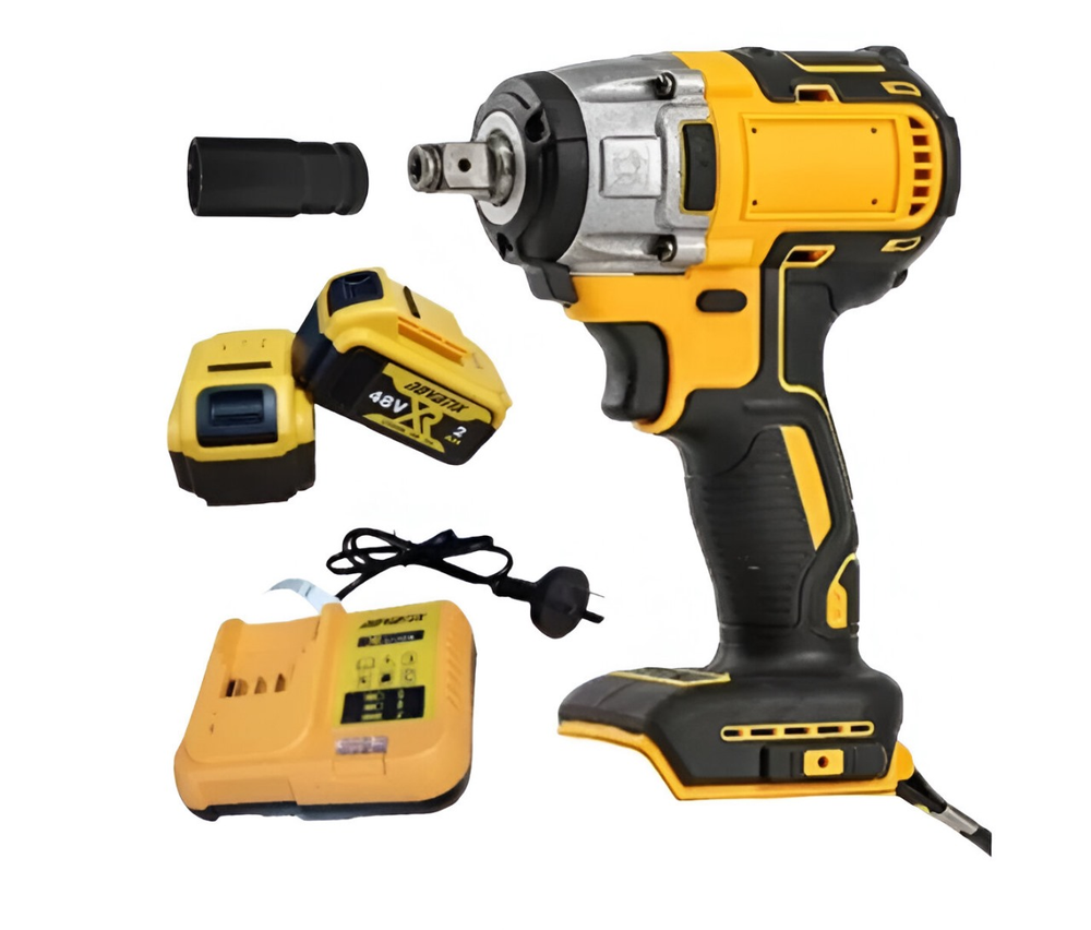 (Uno de los aspectos más destacados de este producto es su función de destornillador, lo que lo convierte en una herramienta versátil para una variedad de tareas. Trae 2 baterías de 48V y 1 cargador. Por último, la llave de impacto viene en una funda, para que puedas mantenerla segura y organizada).