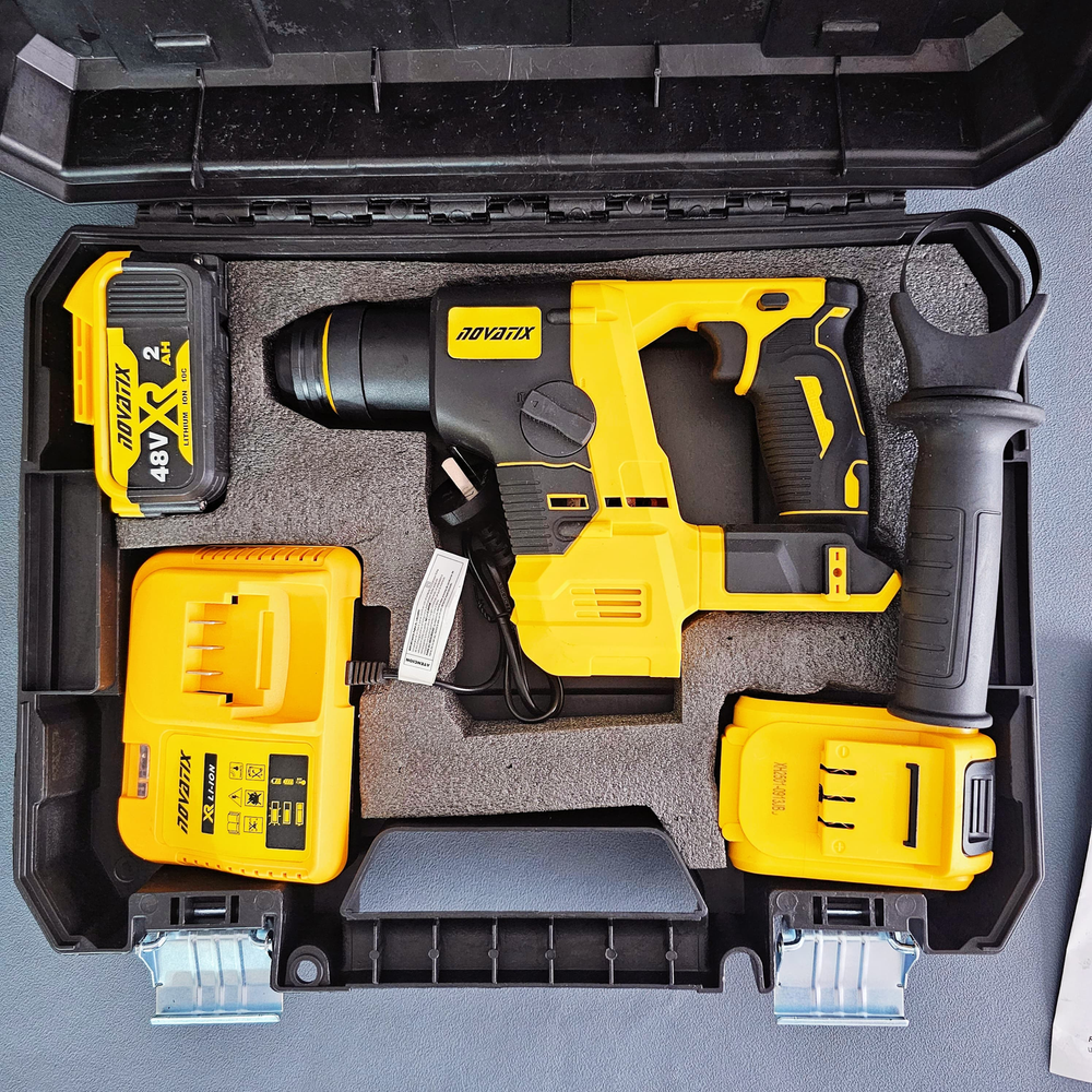(Martillo ultra compacto marca NOVATIX de 48v, tambiem cuenta con dos baterias de 48v cada una y un cargador. Además cuenta con un mango para mas seguridad a la hora de agarrarlo. Tiene 3600 impactos por minuto. Cuenta con su maletín para llevarla con seguridad a sus obras o donde decida usarla sin miedo que pueda romperse ) .
