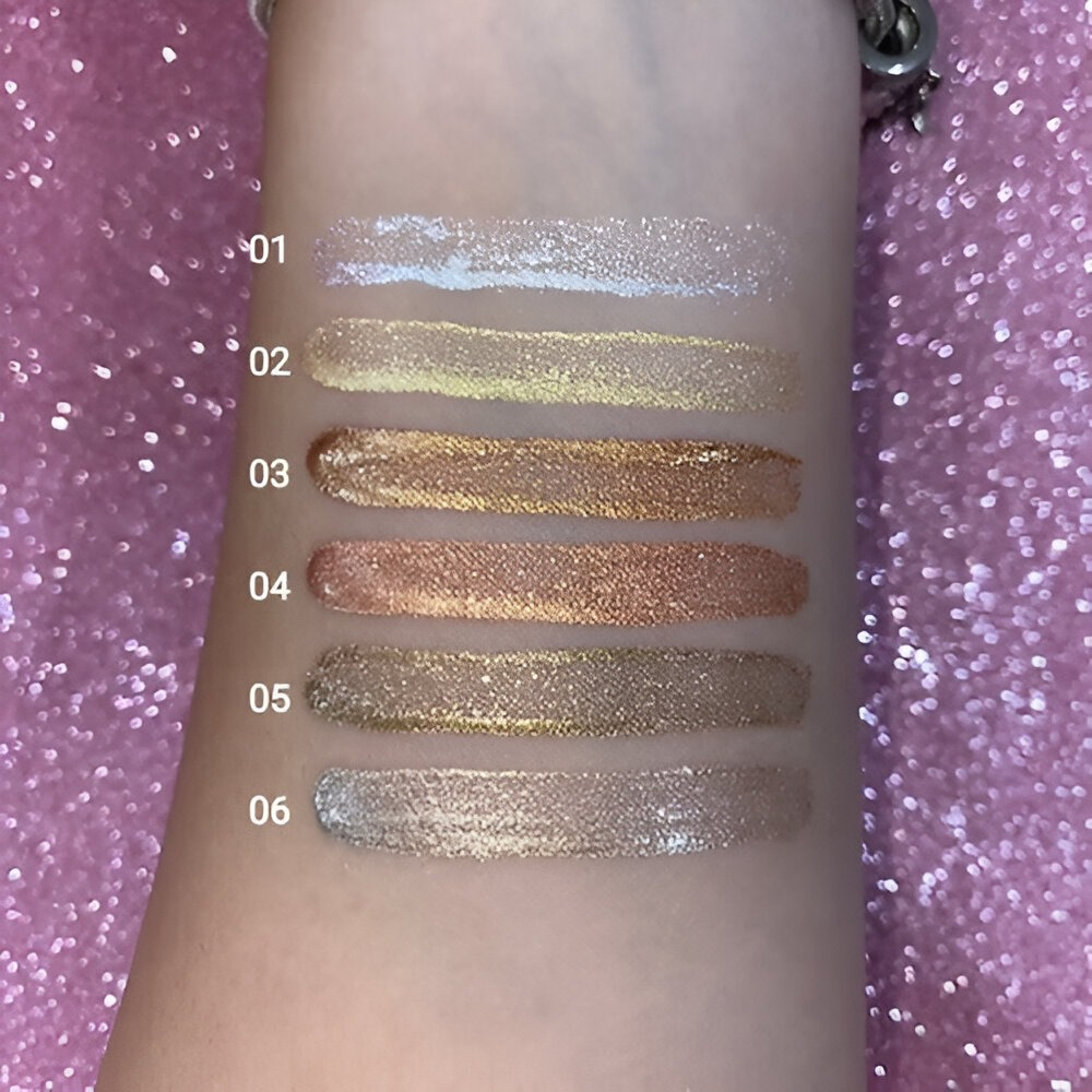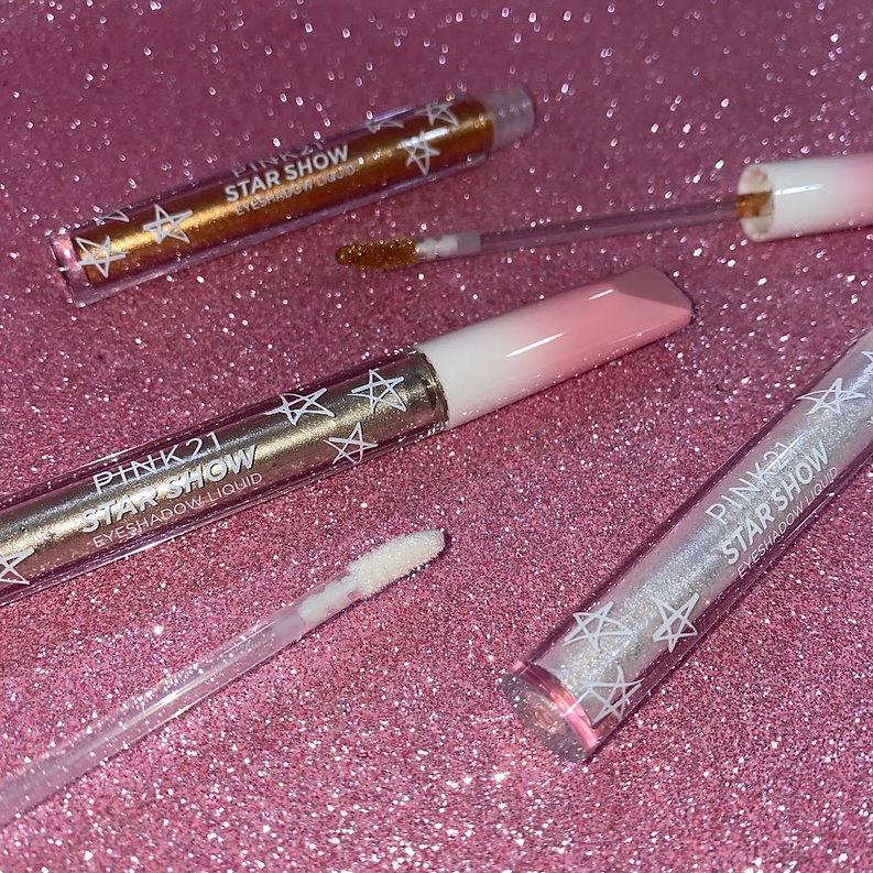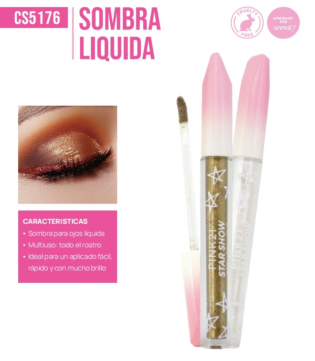 (Sombra liquida Star Show marca "Pink 21". Vienen 6 tonos a elección. Posee un efecto metálico y glitter para un brillo intenso. Ideal para resaltar la belleza de tus ojos. Sus piezas cuentan con una capacidad de 5ml).