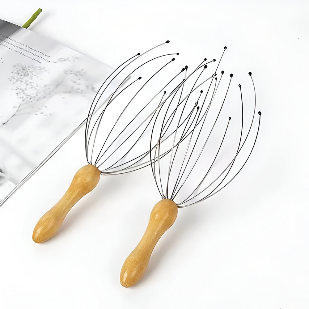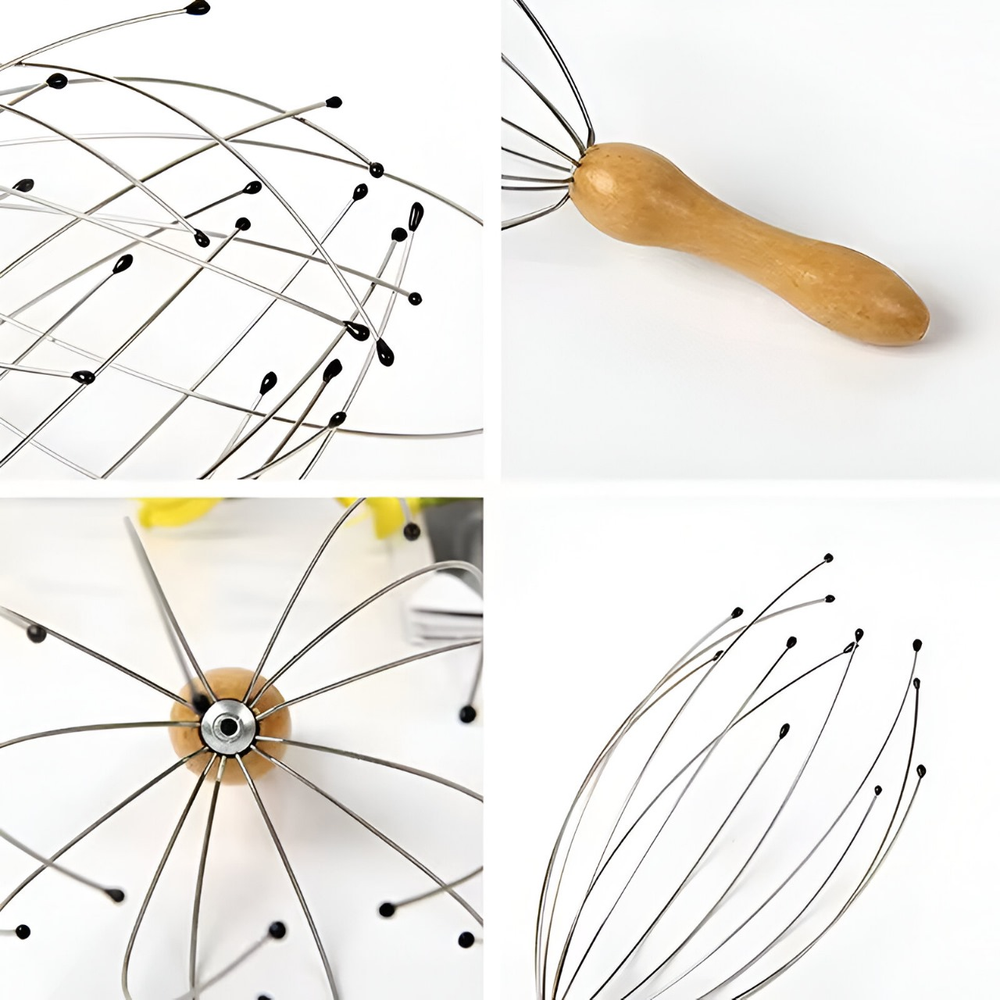 (Masajeador de cuero cabelludo, reduce estrés y tensión, relaja. Es de metal y tiene en su extremo unas pelotitas para no lastimar.)