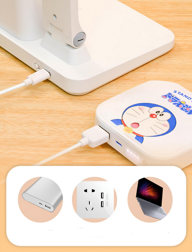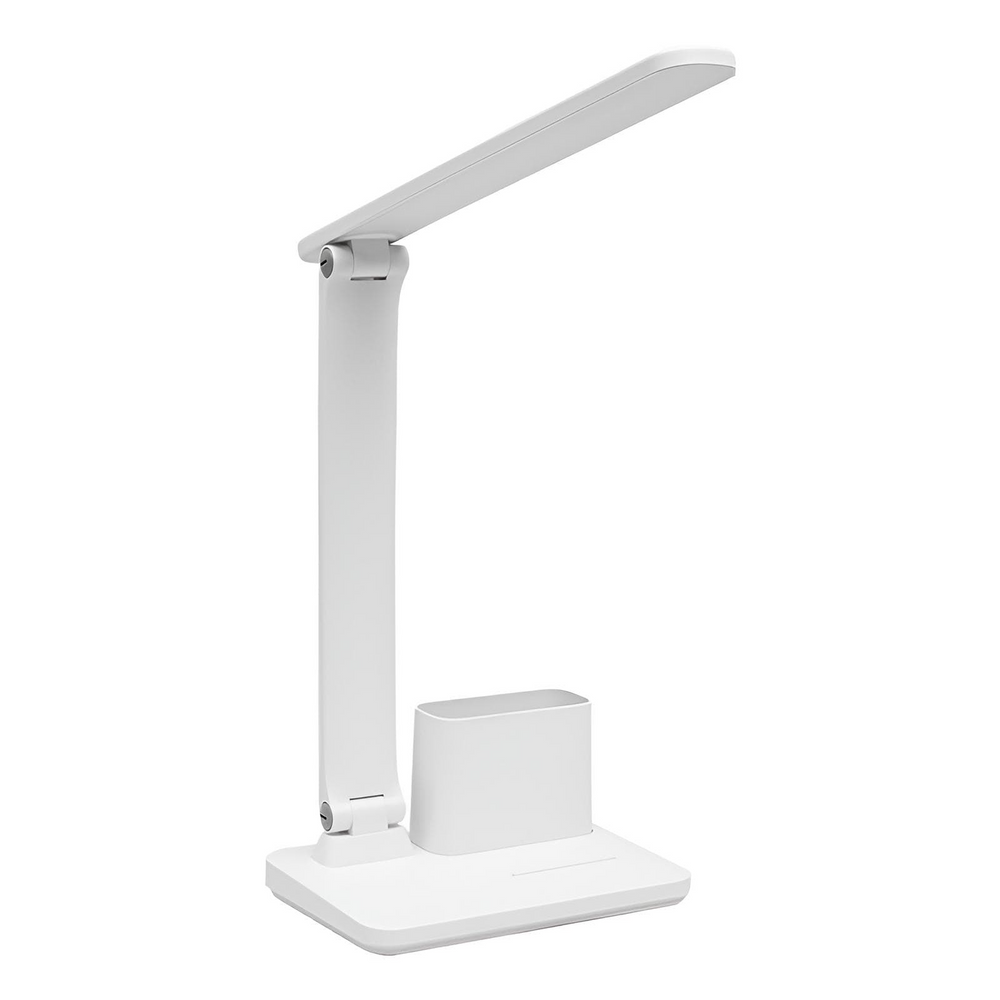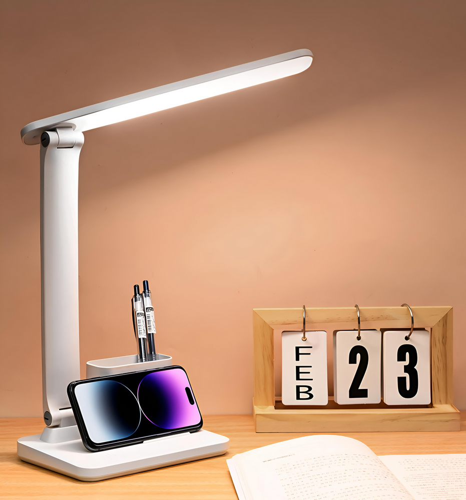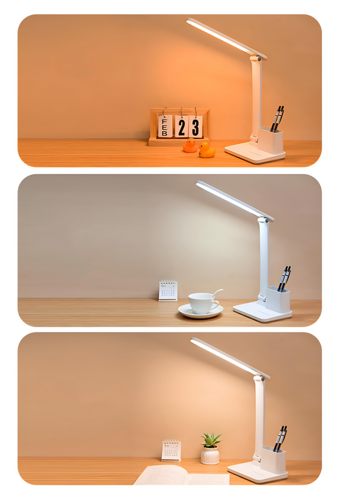 (Lámpara Nocturna doble con 3 niveles de iluminación, cálida, fría y natural. Recargable con carga USB. Su base cuenta con un soporte para lápices y otro para celular).