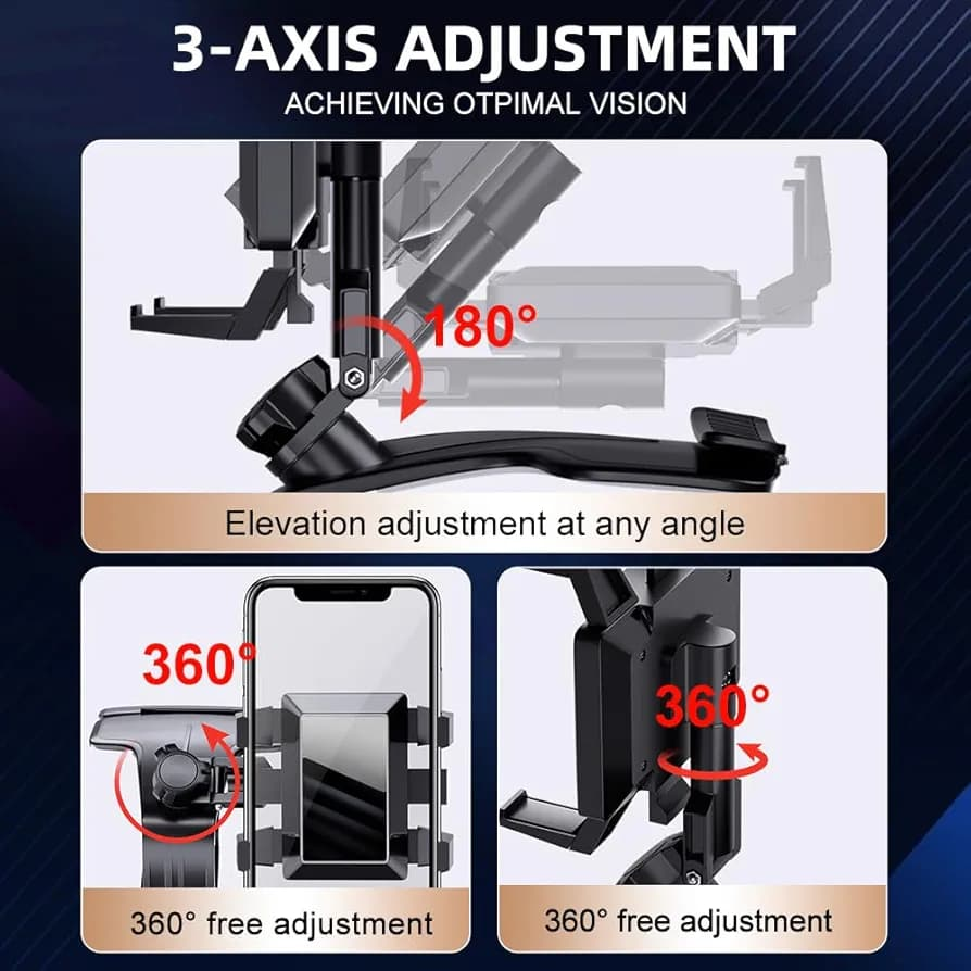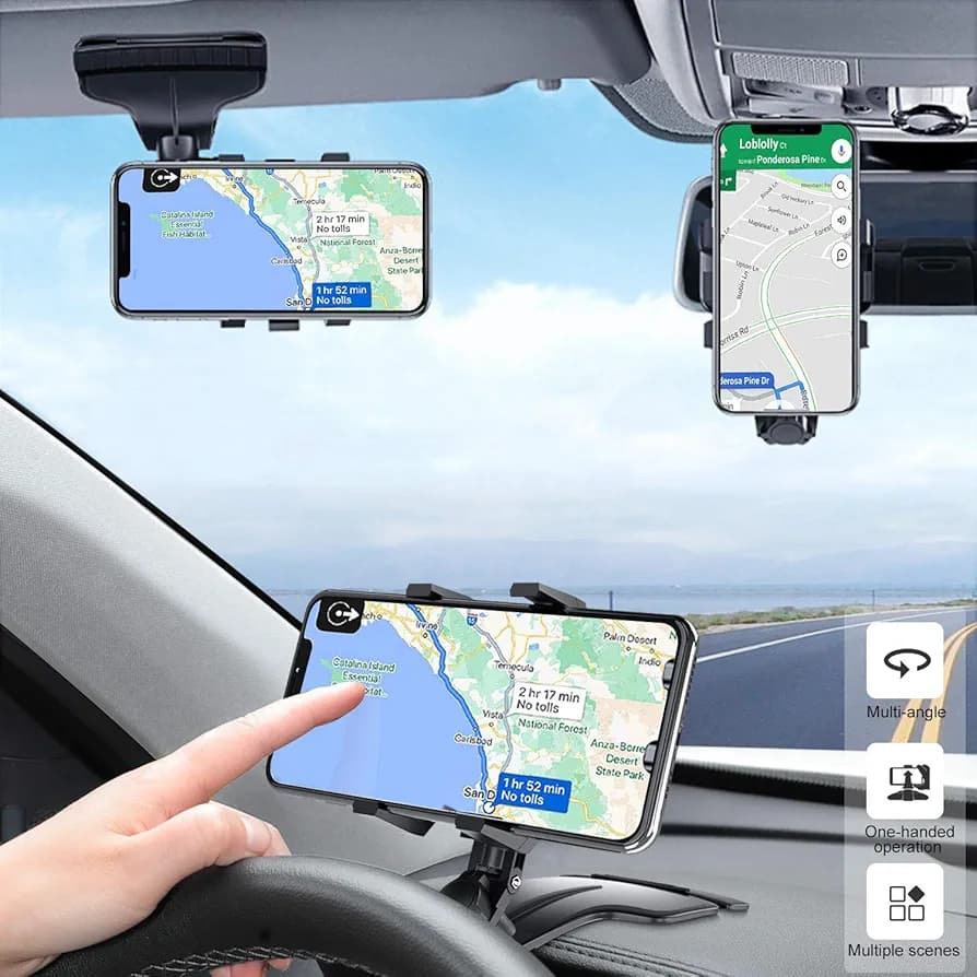 ( Soporte para teléfono equipado con muelles de alta resistencia y cuatro brazos para asegurar que el teléfono no se caiga. La almohadilla antideslizante integrada mantiene el dispositivo estable sin dañar el teléfono, y también puede hacer frente fácilmente a golpes de velocidad. el soporte de espejo retrovisor giratorio de 1200 ° adopta un diseño de triple giro).