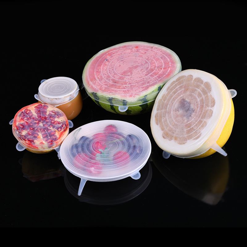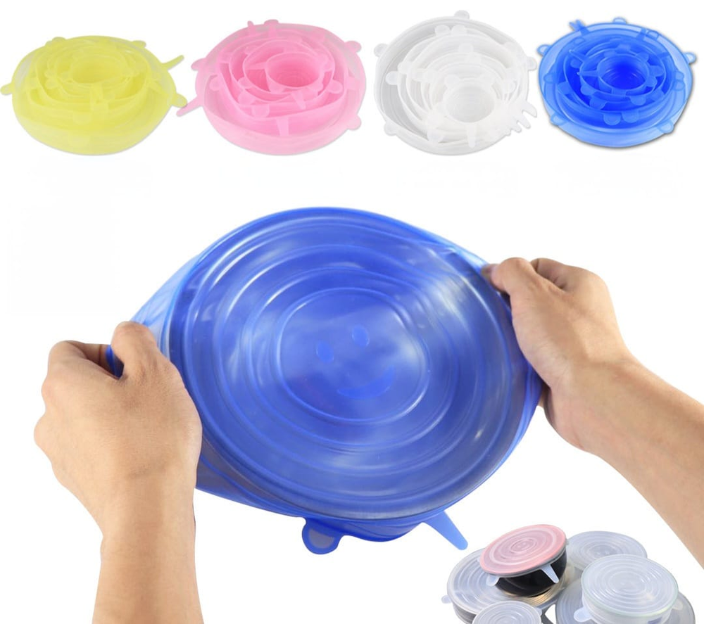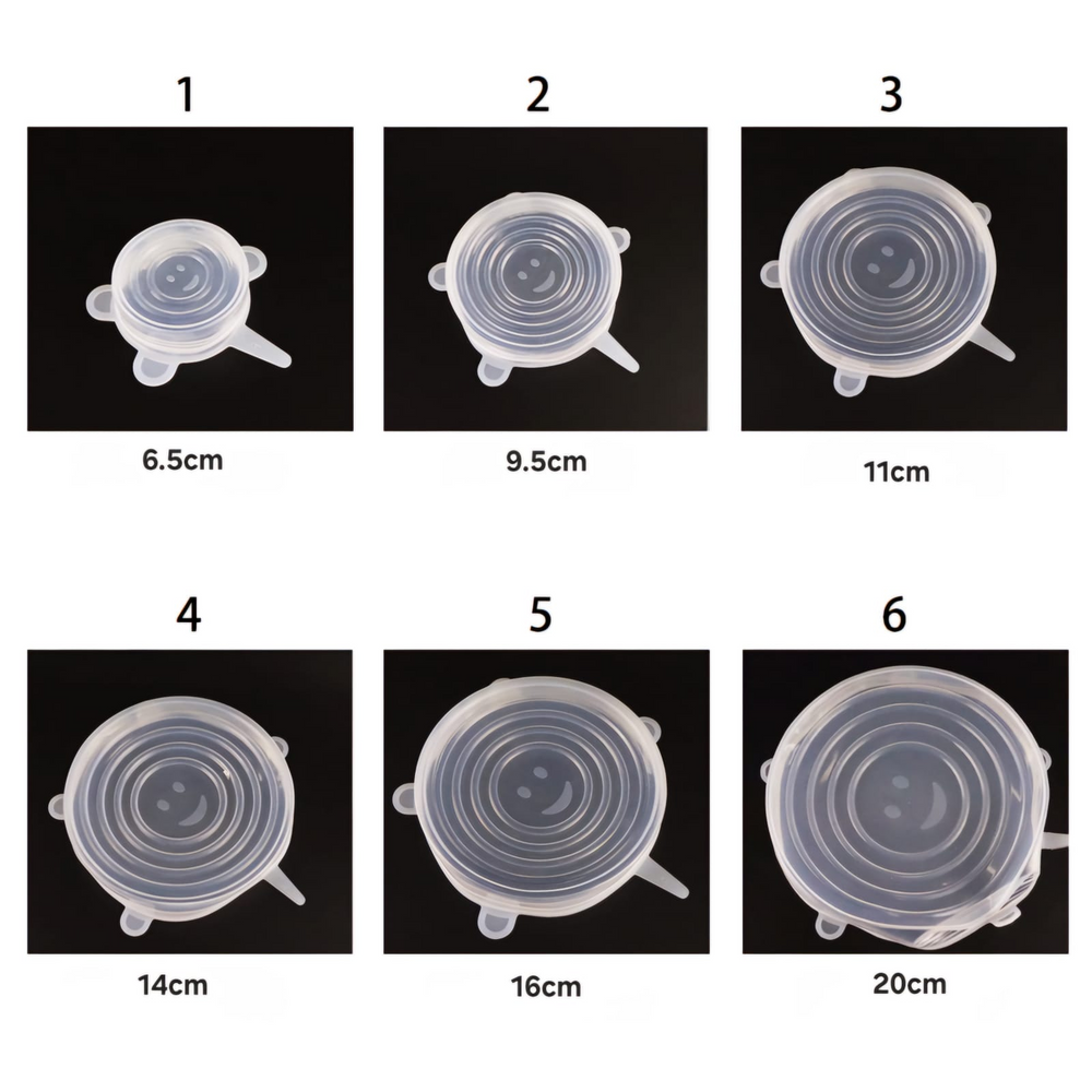 (Tapas elasticas de silicona que sirven para que tus alimentos no se pongan feos en la heladera, cubriéndolos excelentemente. Sus medidas son de la mas chica a la mas grande, viene el set completo de 6 unidades: N°1 6,5cm N°2 9,5cm N°3 11cm N°4 14cm N°5 16cm N°6 20cm).