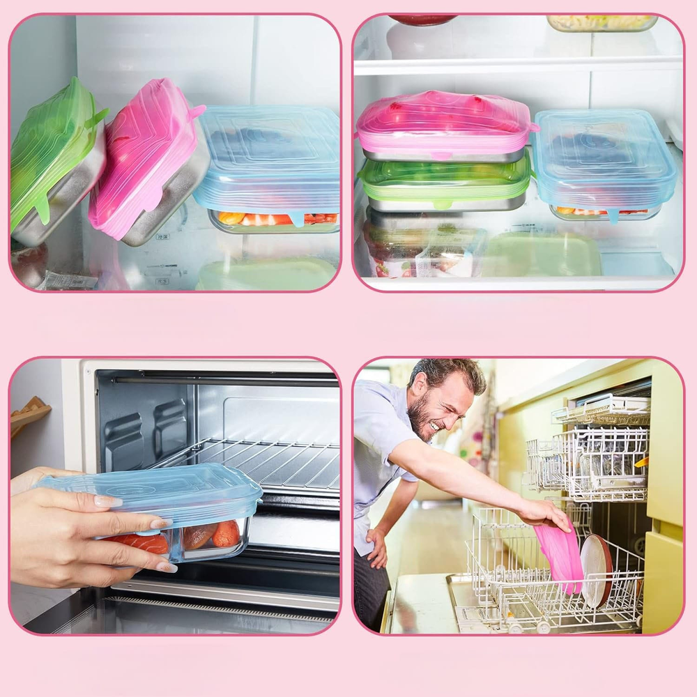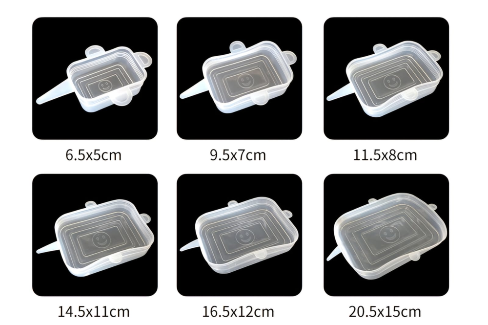 (Tapas elasticas de silicona que sirven para que tus alimentos no se pongan feos en la heladera, cubriéndolos excelentemente. Sus medidas son de la mas chica a la mas grande, viene el set completo de 6 unidades: N°1 6,5x5cm N°2 9,5x7cm N°3 11,5x8cm N°4 14,5x11cm N°5 16,5x12cm N°6 20,5x15cm).