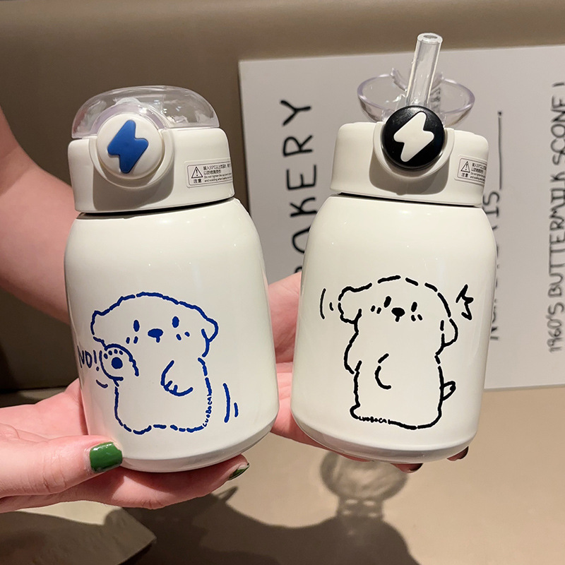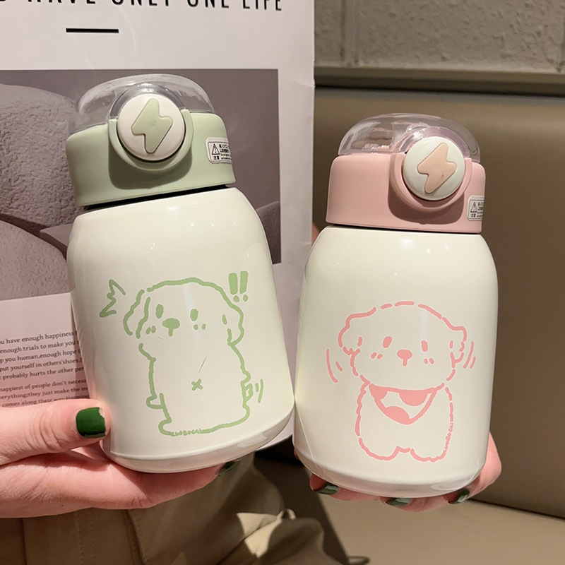 (Botella de acero inoxidable disponible en varios colores con diseño de perrito, cuenta con sorbete, pico y tapa a rosca, fácil de llevar a cualquier lado).