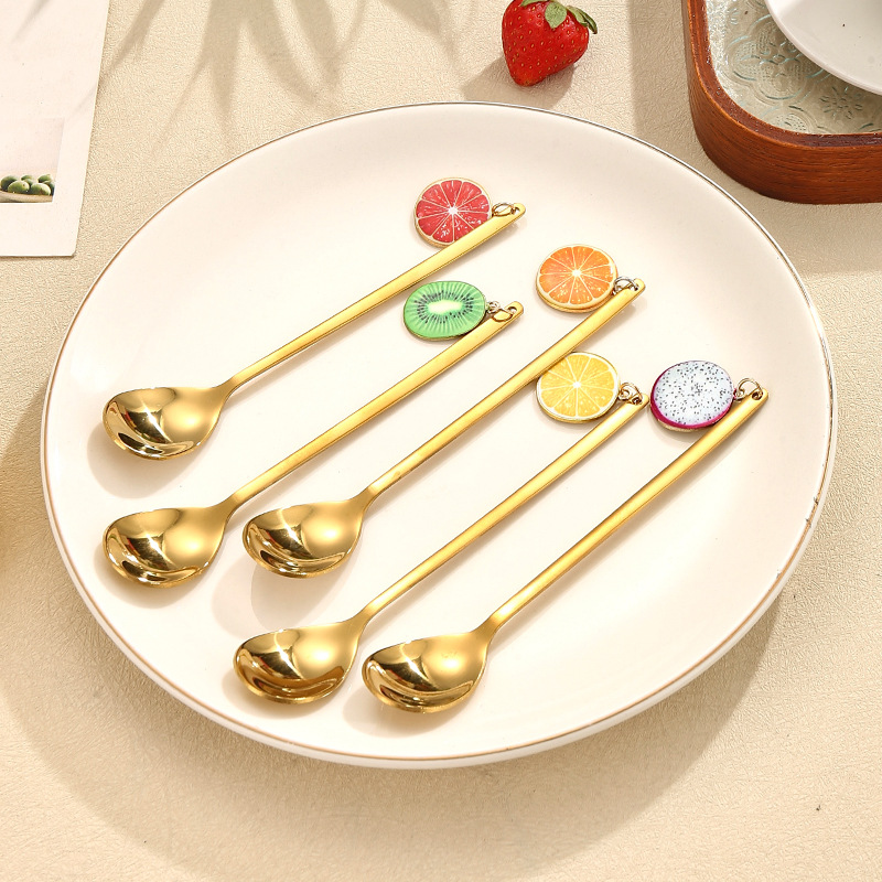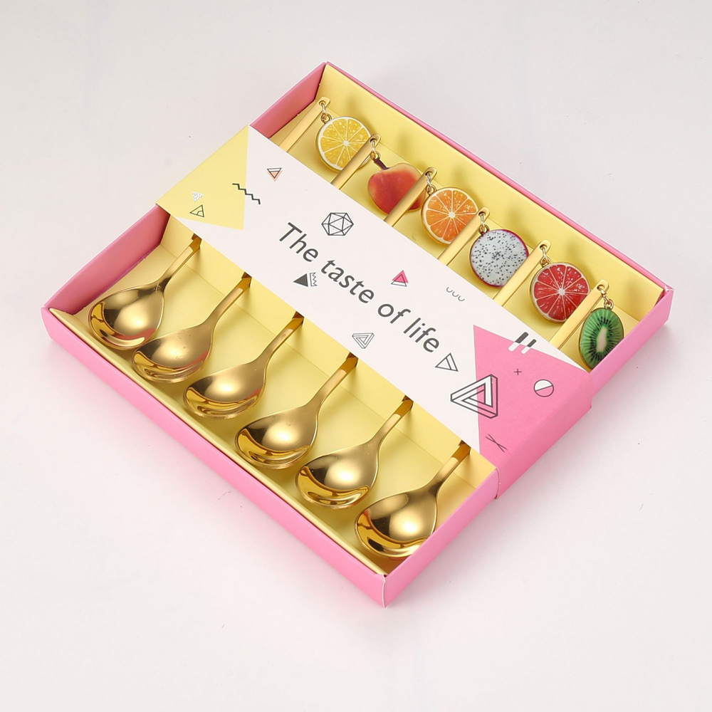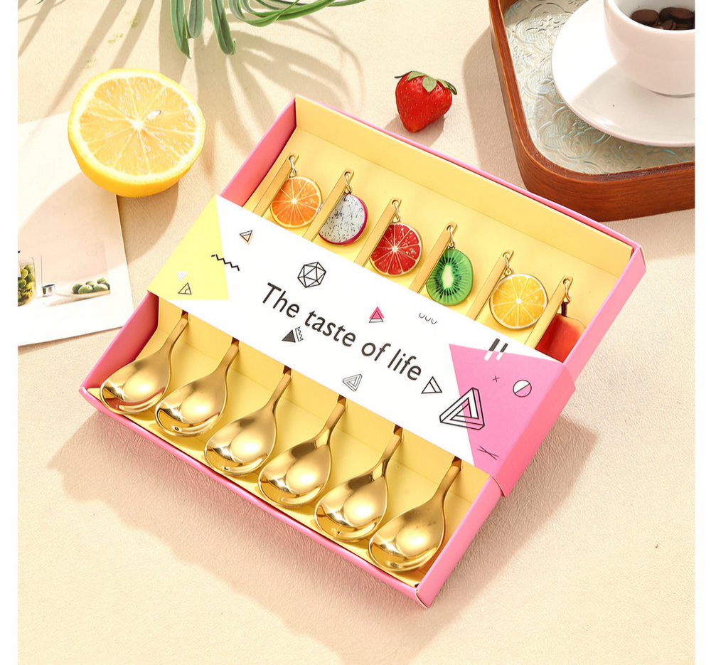 (Caja x 6U. Cucharas de acero inoxidable en color dorado, cada una cuenta con un dije en forma de fruta. Ideal para regalar).