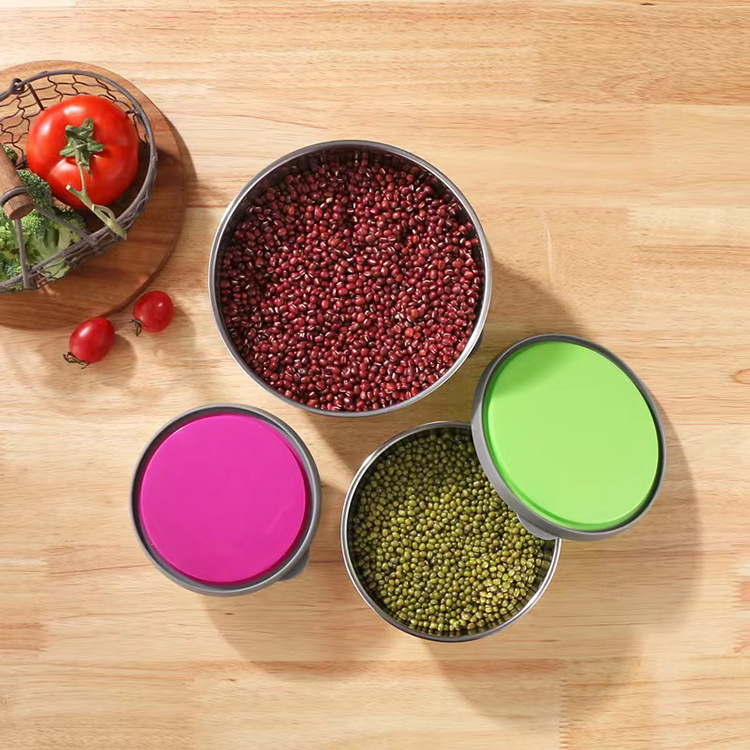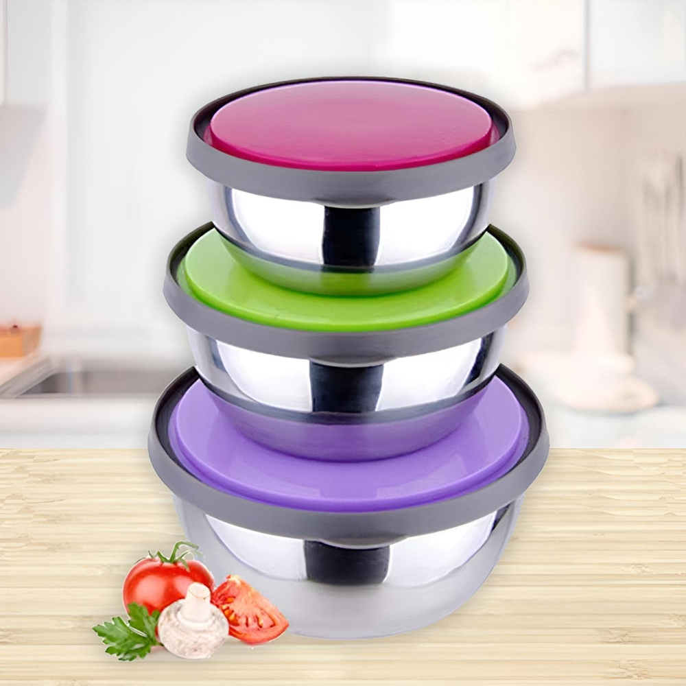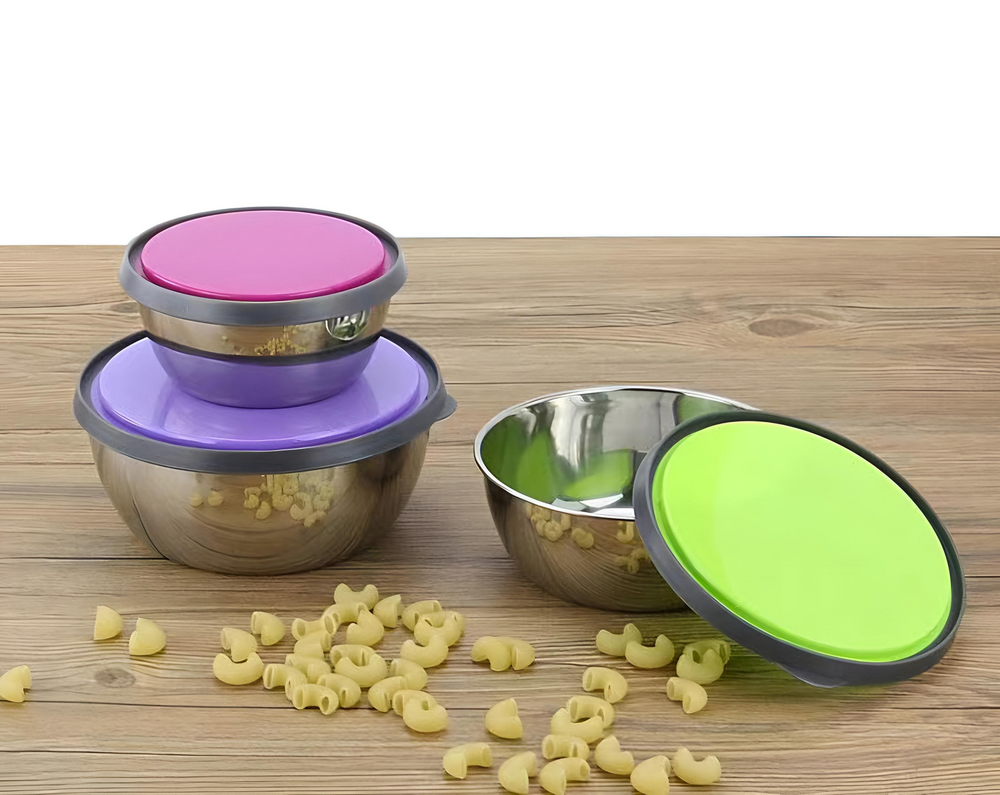 (Set x3U. Bowls con tapa de acero inoxidable, vienen en tres medidas diferentes, ideal para ensaladas y postres, de material resistente). (Medidas: Chico: Alto: 5.5cm Diámetro: 12cm - Mediano: Alto: 5.5cm Diámetro: 14 cm - Grande Alto: 6cm Diámetro: 16cm Aprox).