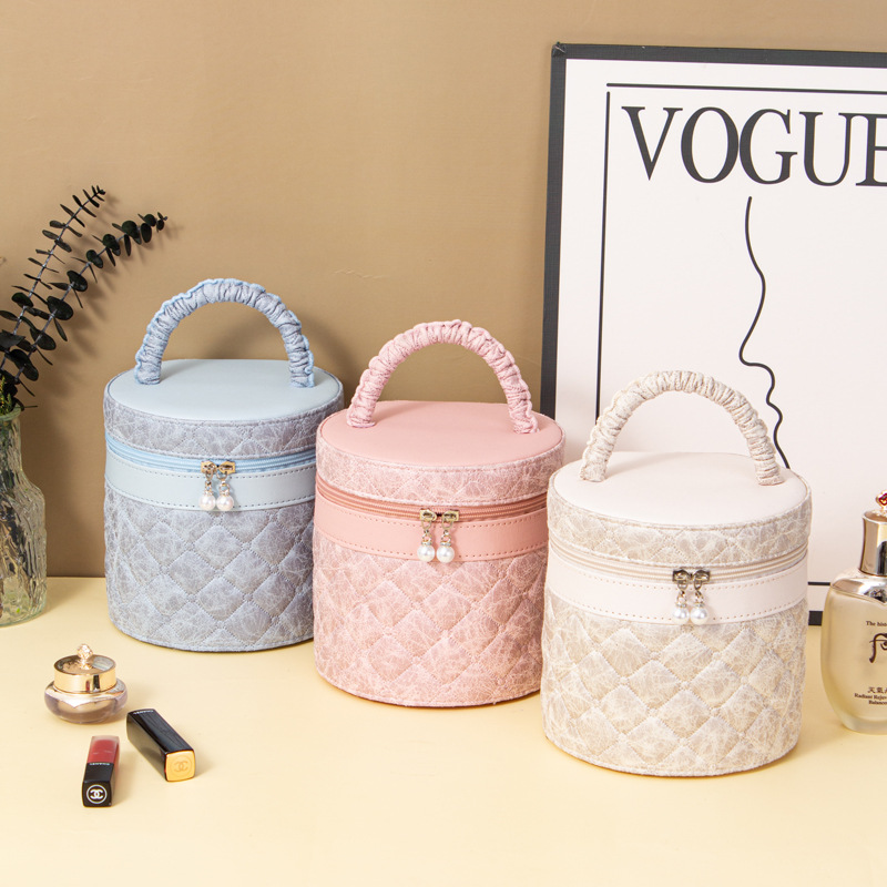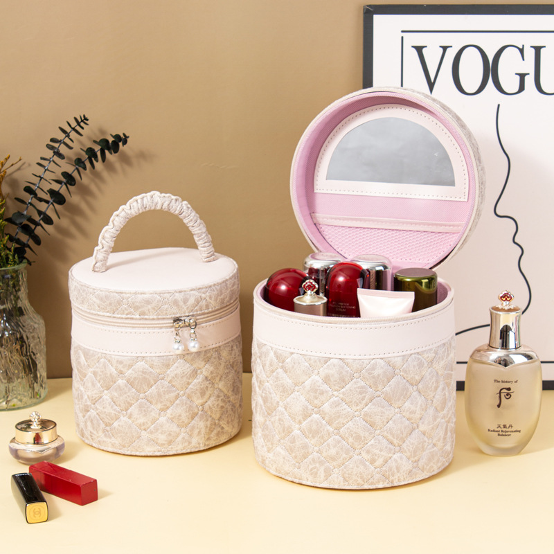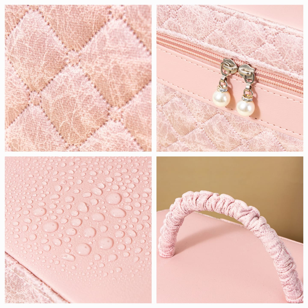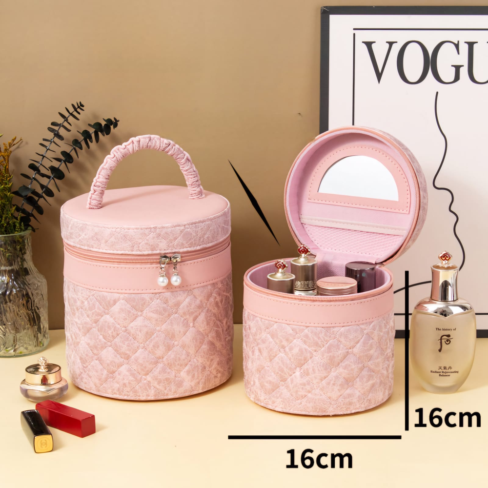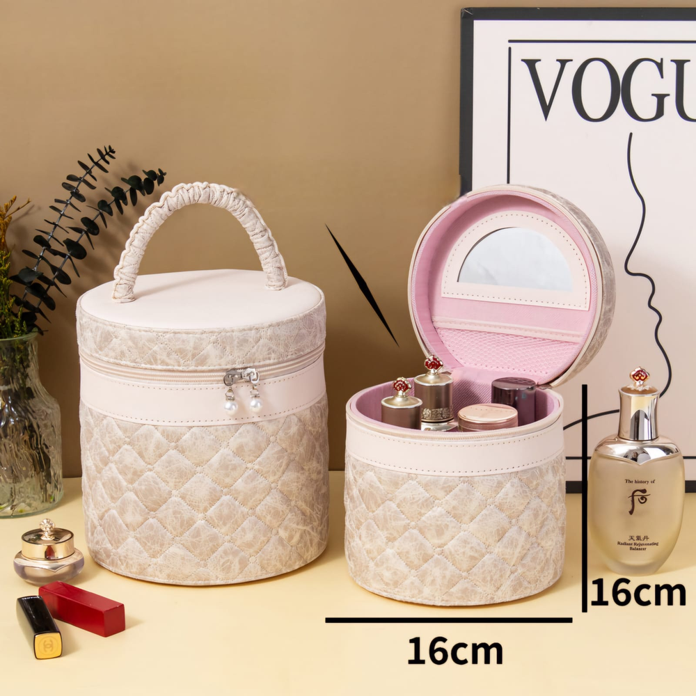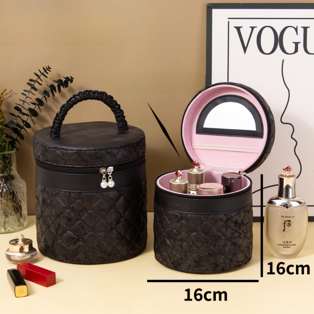 (Portacosméticos de 2 piezas, uno grande y otro mas pequeño, ambos cuentan con espejo, manija y un accesorio de perlas en los cierres. Estos portacosméticos son especiales para mantener tus accesorios o cosas ordenadas).