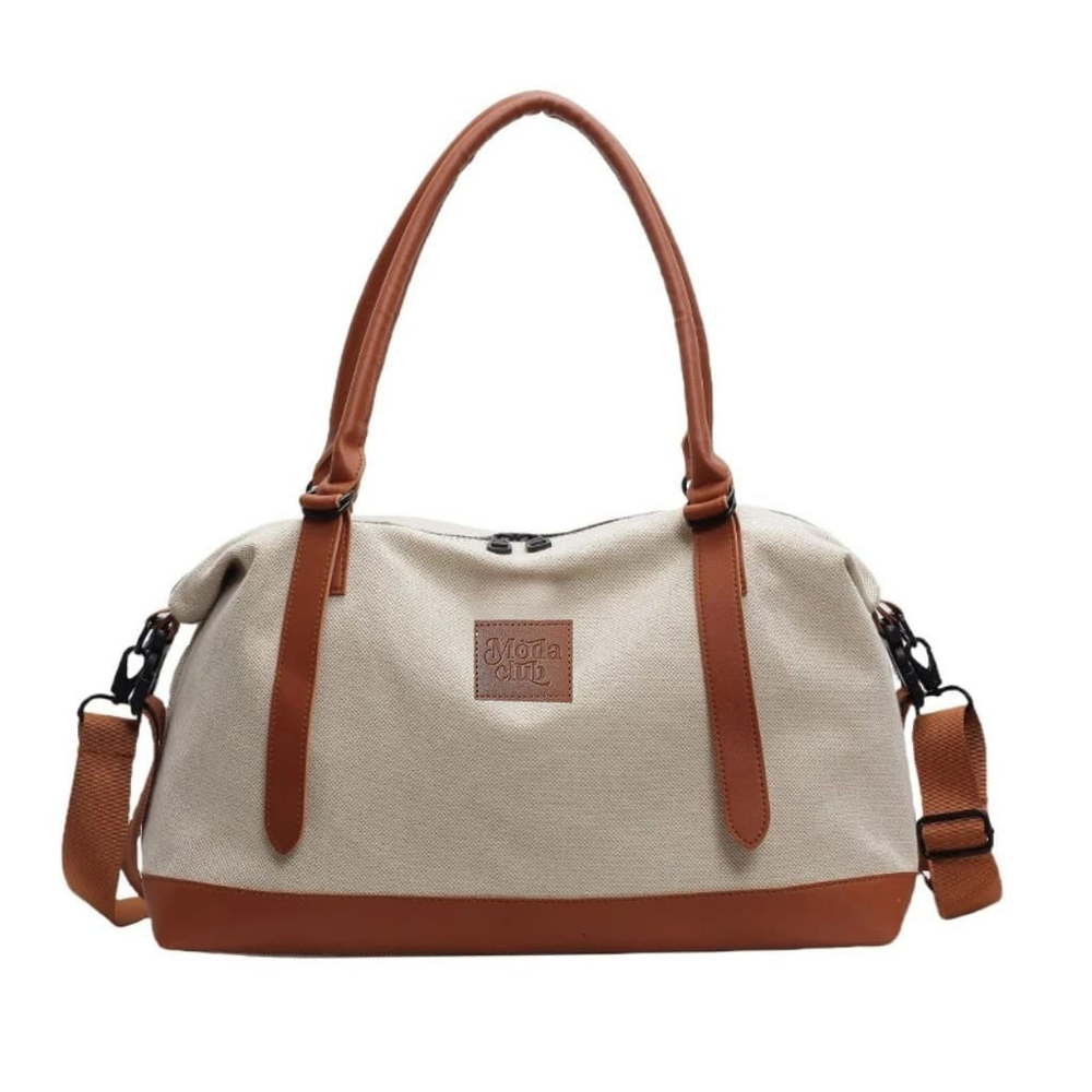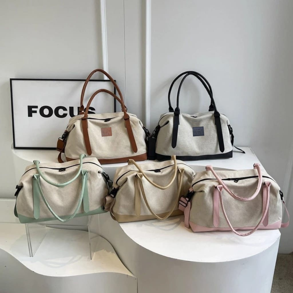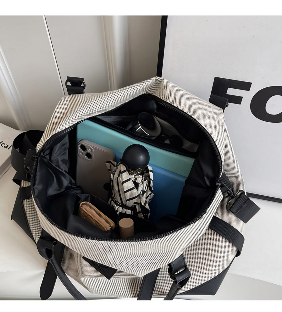 (Bolso de Viaje de gran capacidad, diseñado para apoyar arriba de la valija. Cuenta con una correa, bolsillo frontal con cierre, dos bolsillos internos y uno para húmedos, tiene 2 tiras ajustables).
