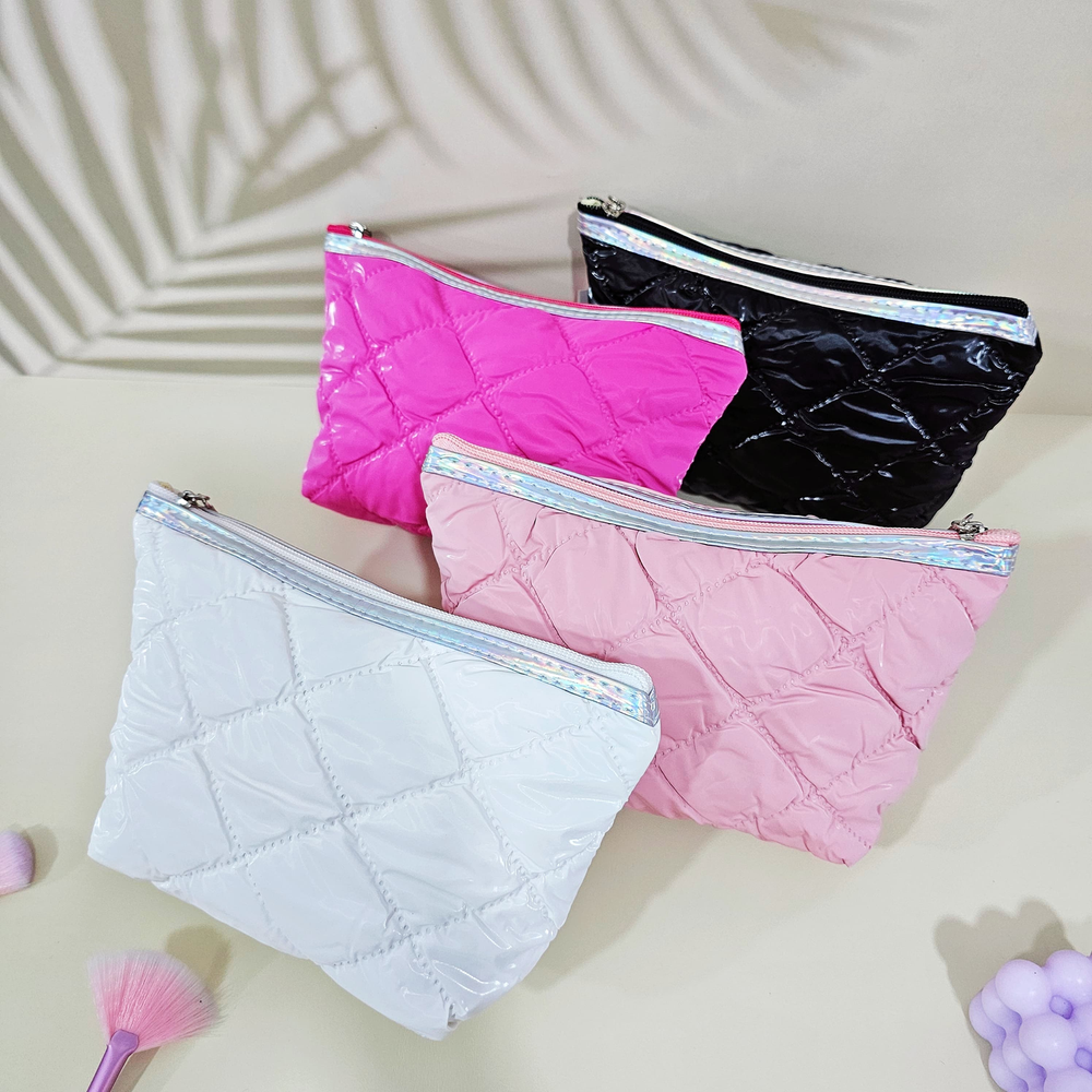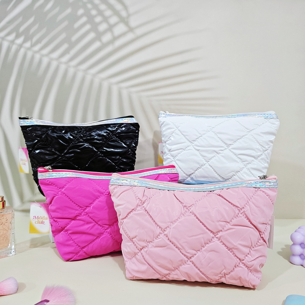 (Neceser de tela, cuenta con un compartimiento principal amplio y cierre holográfico. Ideal para guardar accesorios, maquillaje, etc. Disponible en 4 colores).