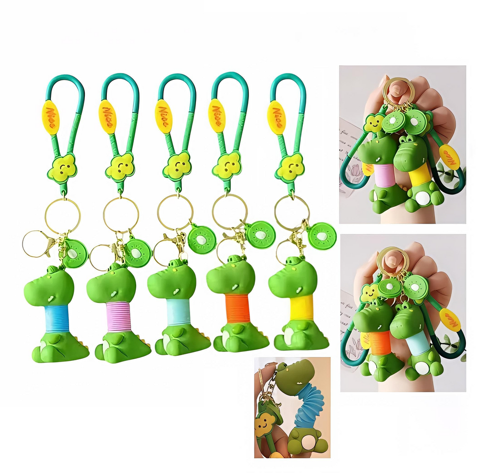 (Llavero de Dinosaurio con cuello de resorte que se estira, en diferentes colores, cuenta con un aro metálico de color dorado. Ideal para regalar).