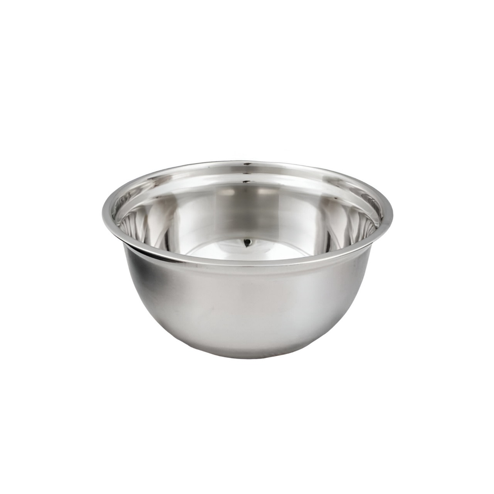 (Bowl de acero . Su exterior pulido mate, con grado de metal que se pueden utilizar como recipiente para mezclar y para servir. Base plana que estabiliza el bowl.)