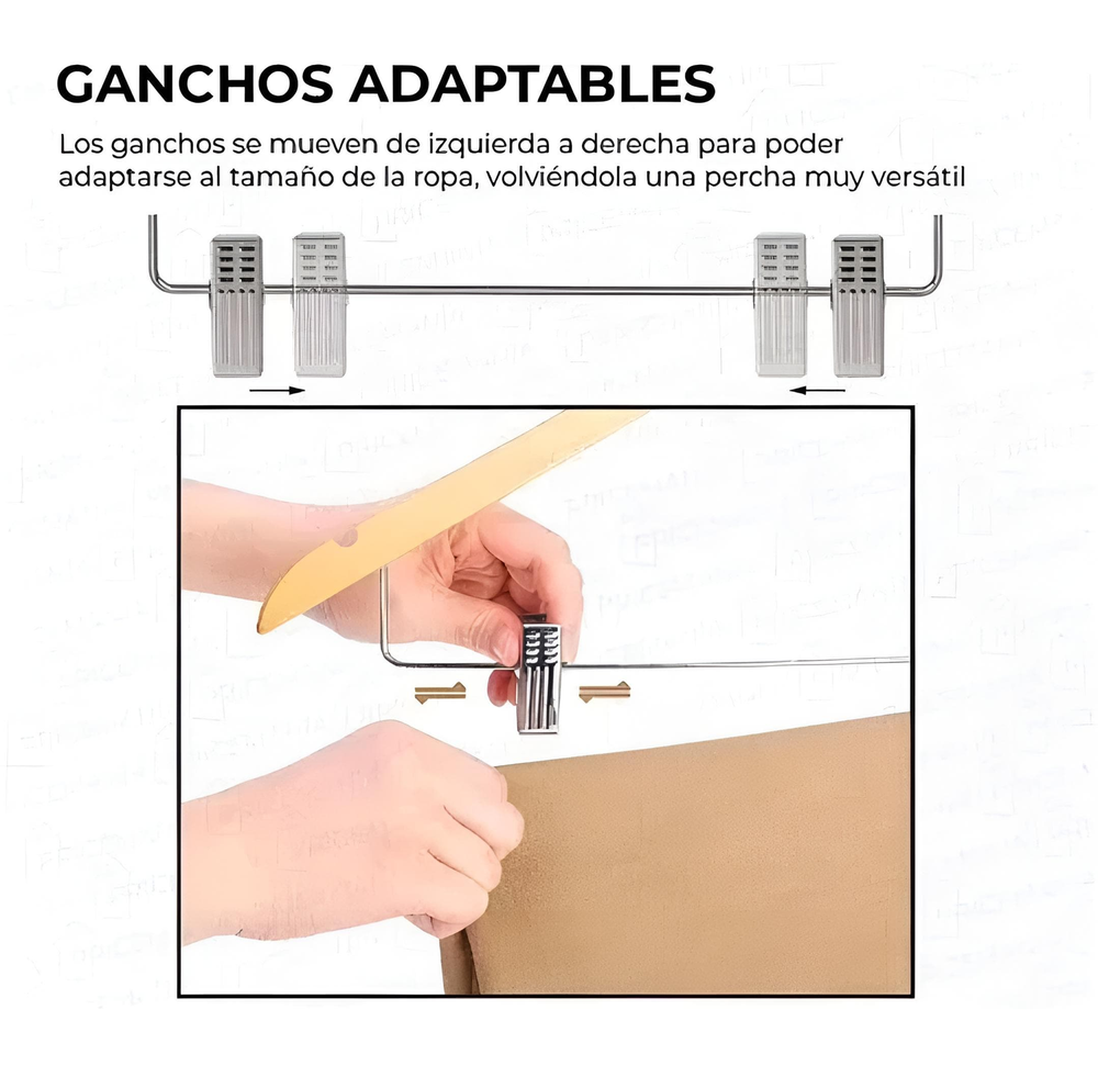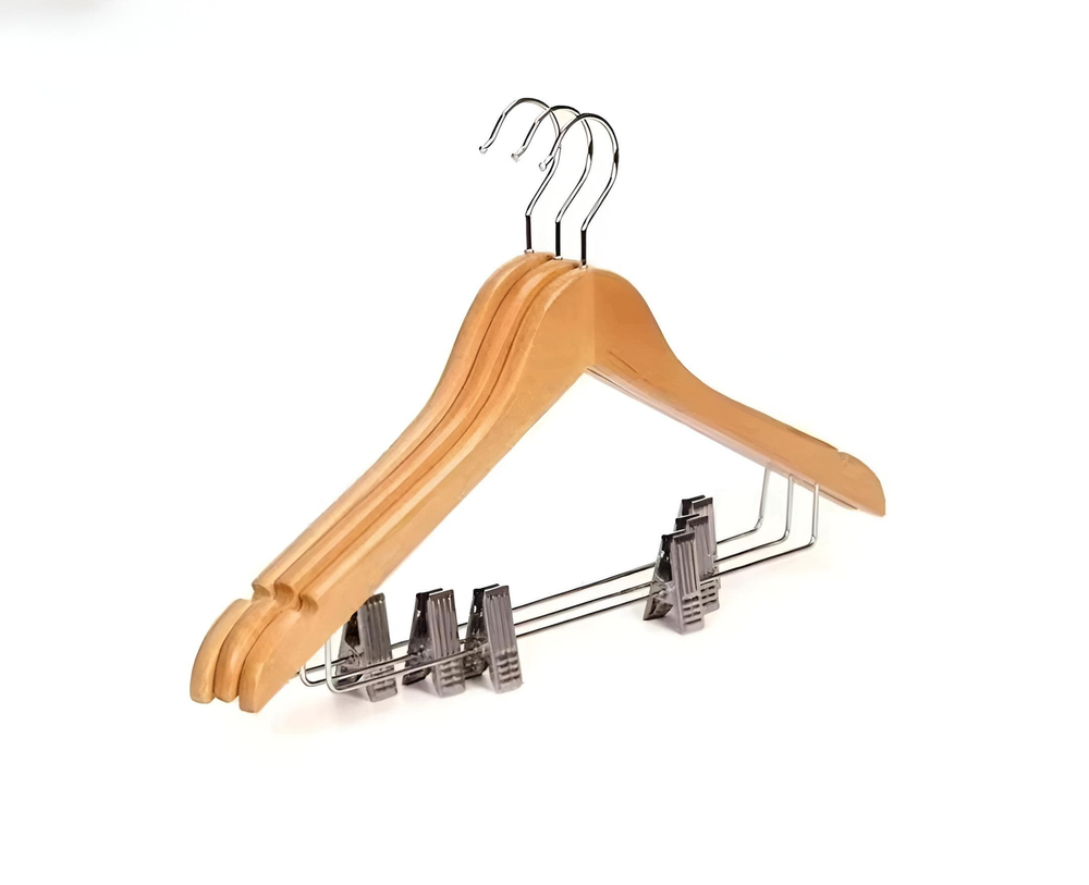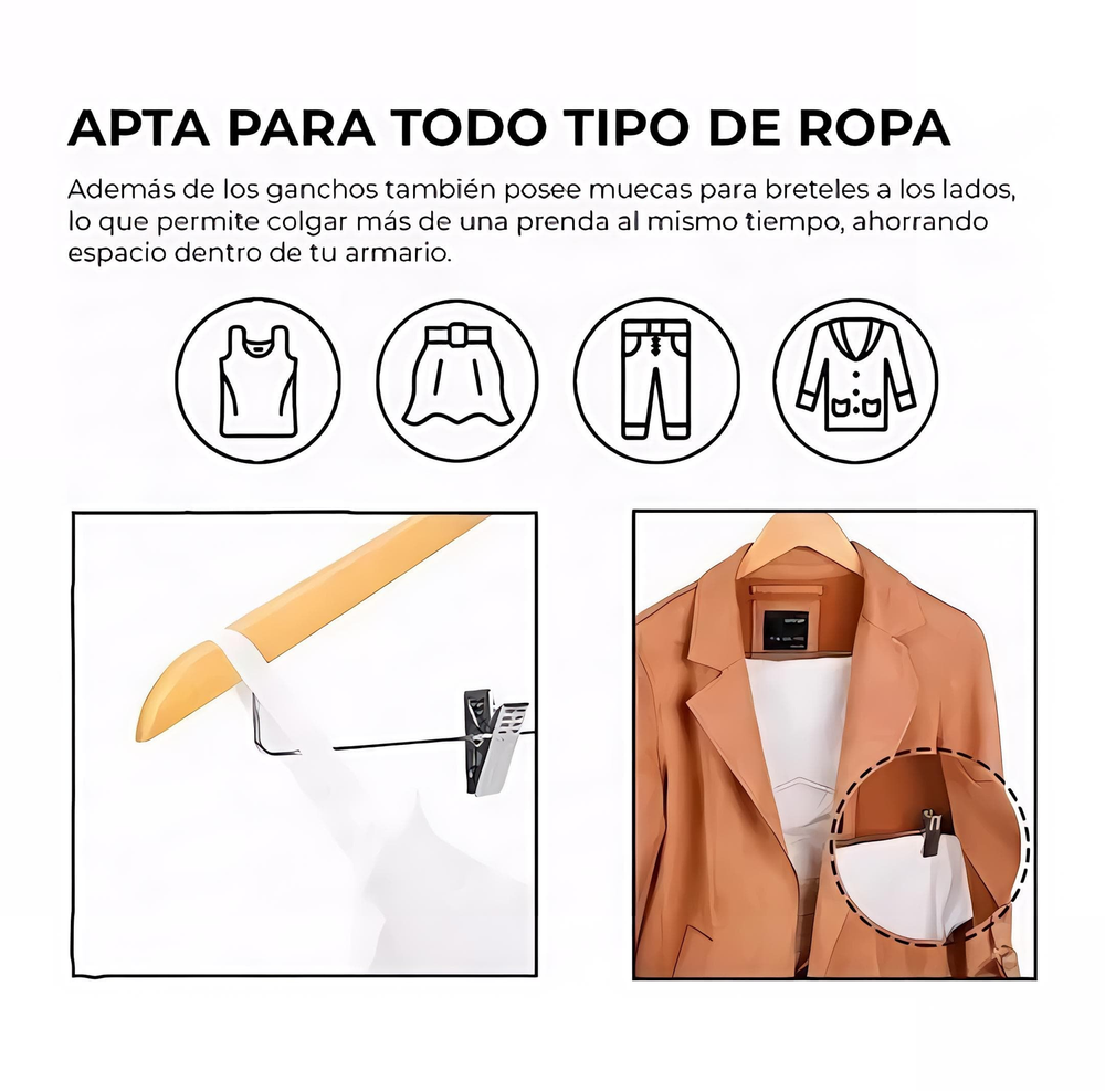 (Set 3 unidades de perchas de madera con su gancho de metal, giratorio. Cuenta también con una alambre y ganchos que facilita la hora de colgar, impidiendo que se caiga la ropa).