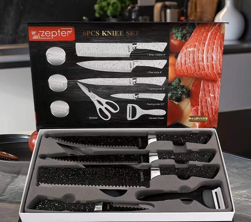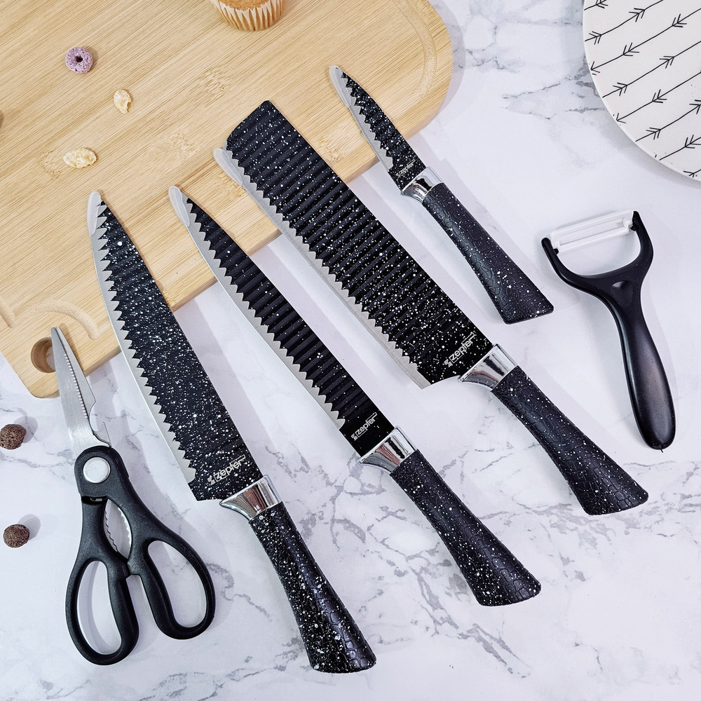 (Set de cuchillos en acero recubiertos en cerámica volcánica x 6 piezas, acero de alta calidad con mangos antideslizante en plástico reforzado para optimizar el trabajo en la cocina de color negro. Incluye: Incluye cuchillo de chef, cuchillo de trinchar, cuchillo pequeño, cuchillo de cocina, tijeras y pelador de cerámica ).