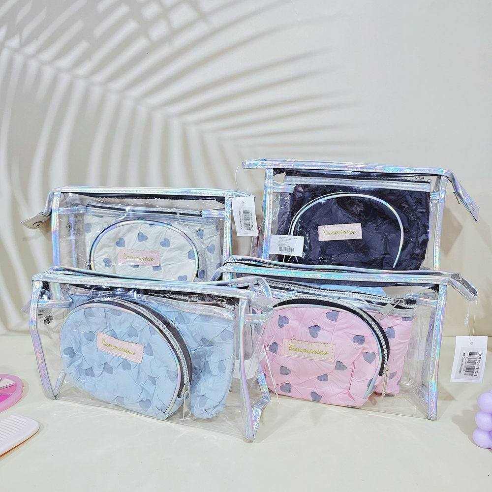 (Cuenta con 3 porta cosméticos, uno transparente grande, uno mediano y uno chico de tela. Ideal para guardar accesorios, maquillaje, etc. Disponible en 3 colores. Grande: Largo: 23cm x Ancho: 7 cm x Alto: 16cmAprox. Mediano: Largo: 19,5 cm x Ancho: 14cm Aprox. Chico: Largo: 14,5 cm x Ancho: 12cm Aprox.).