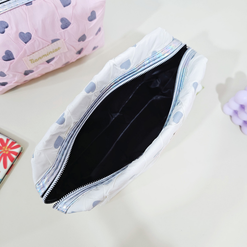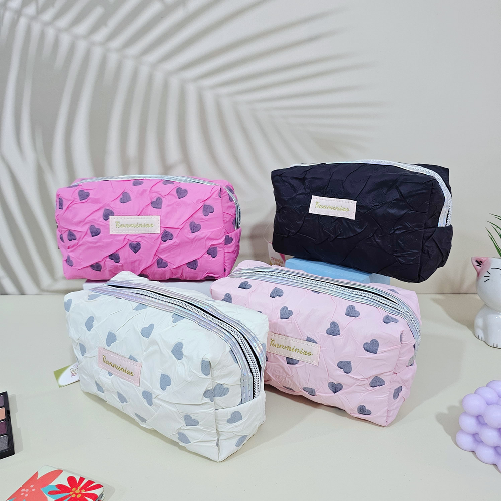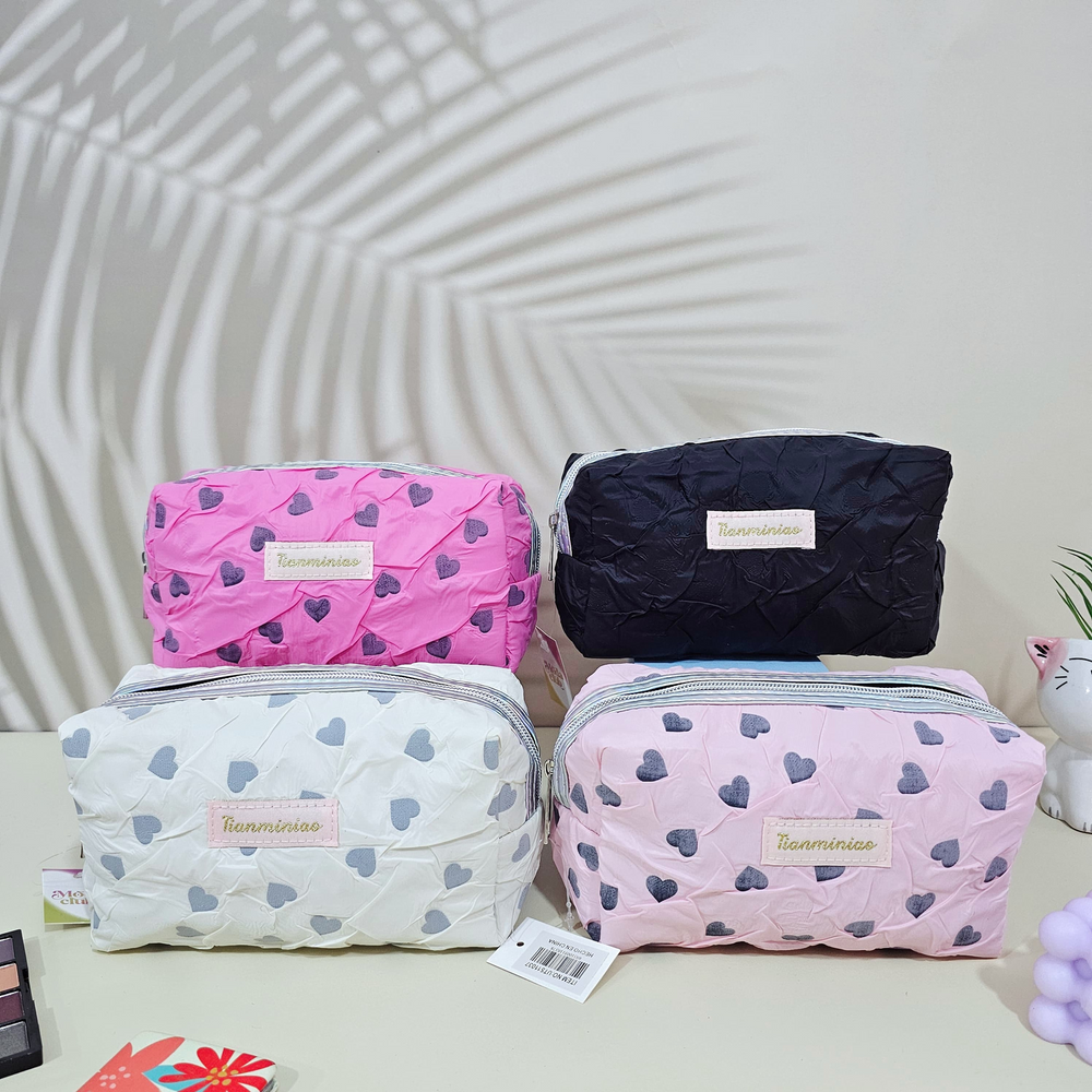 (Portacosmetico con un compartimiento amplio, cierre holográfico y diseño de corazones . Ideal para guardar accesorios, maquillaje, etc. Disponible en 4 colores).