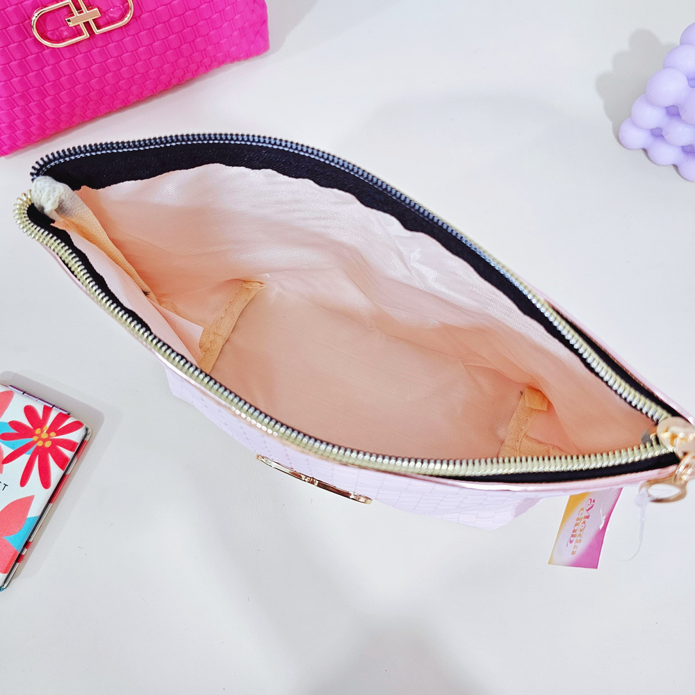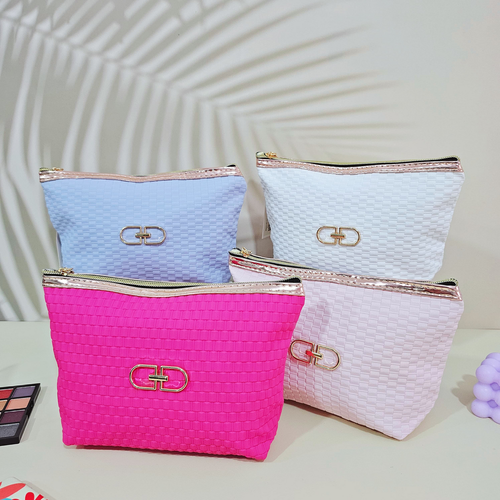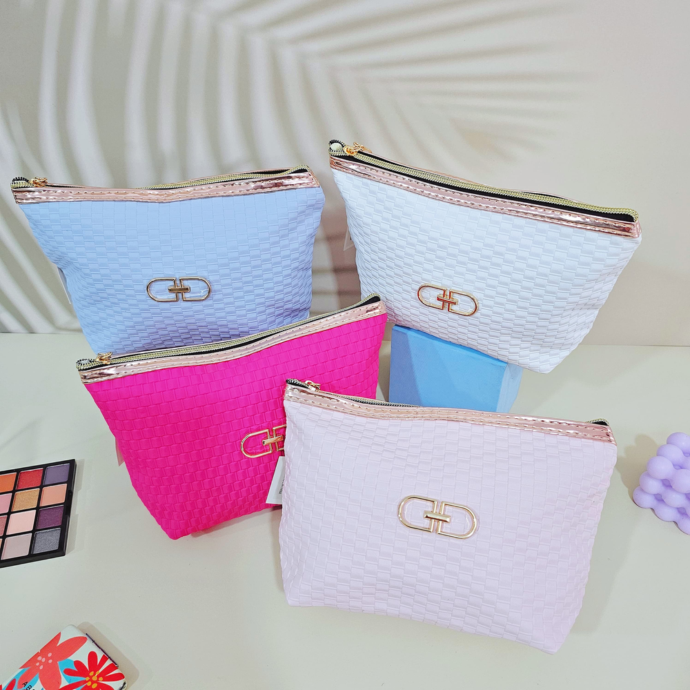 (Portacosmetico con un compartimiento amplio, cierre holográfico y un dije . Ideal para guardar accesorios, maquillaje, etc. Disponible en 4 colores).