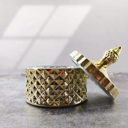 (Caramelera de vidrio, en su exterior es color dorada y con tapa. Tiene forma circular con relieve.)
