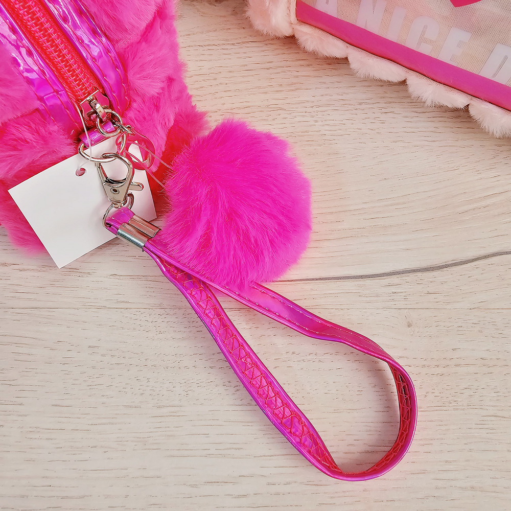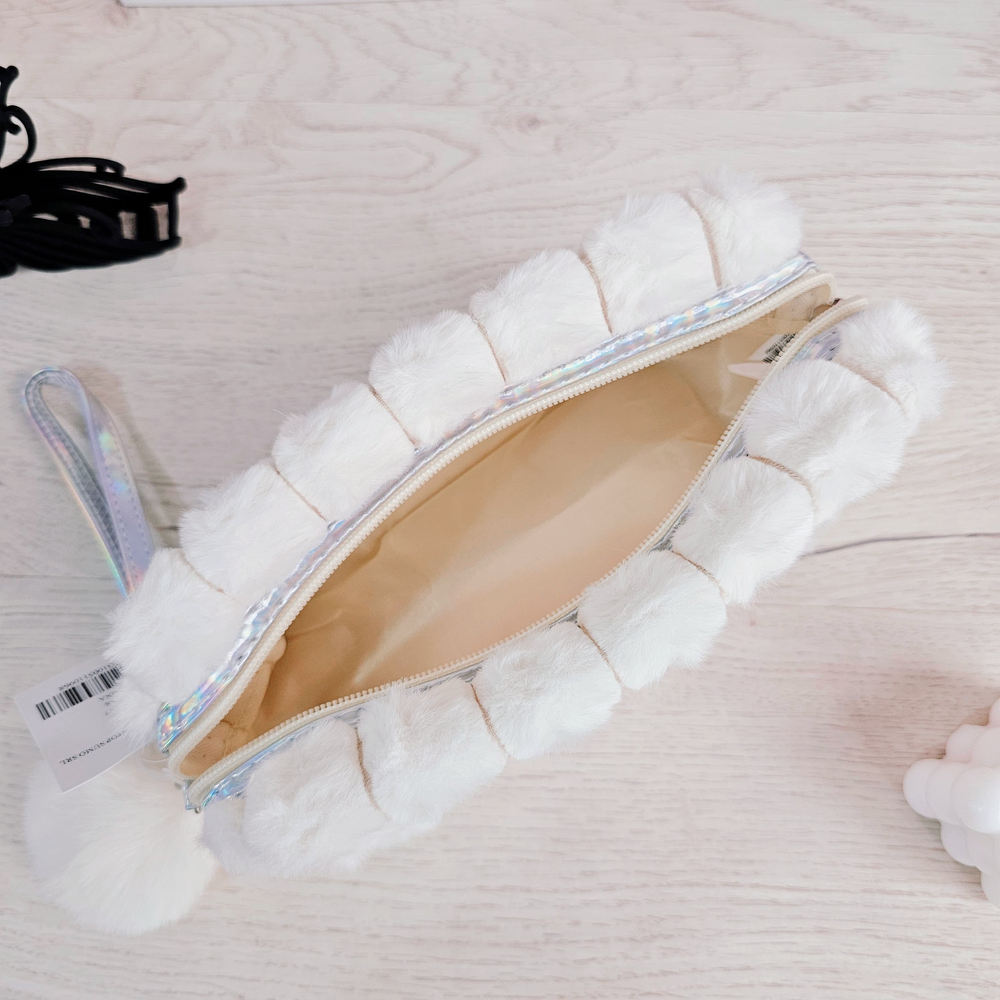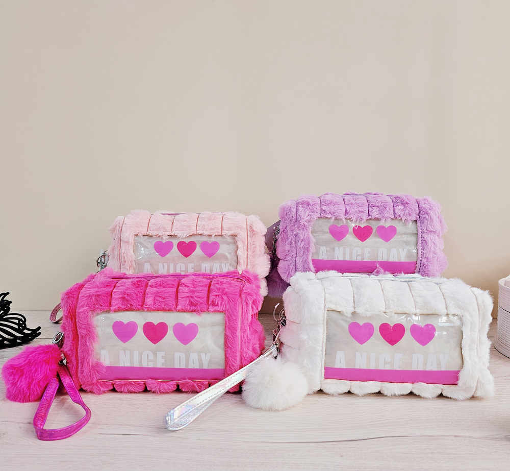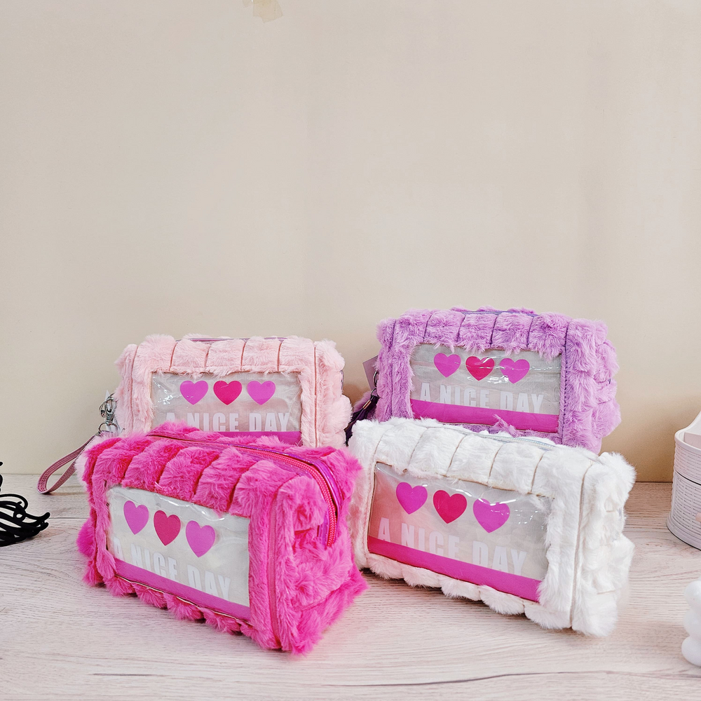 (Portacosmetico que cuenta a su alrededor con peluchito y en su centro con plástico transparente, cuenta también con un pompón en su costado para poder agarrarlo. Ideal para guardar maquillaje o lo que mas te guste).