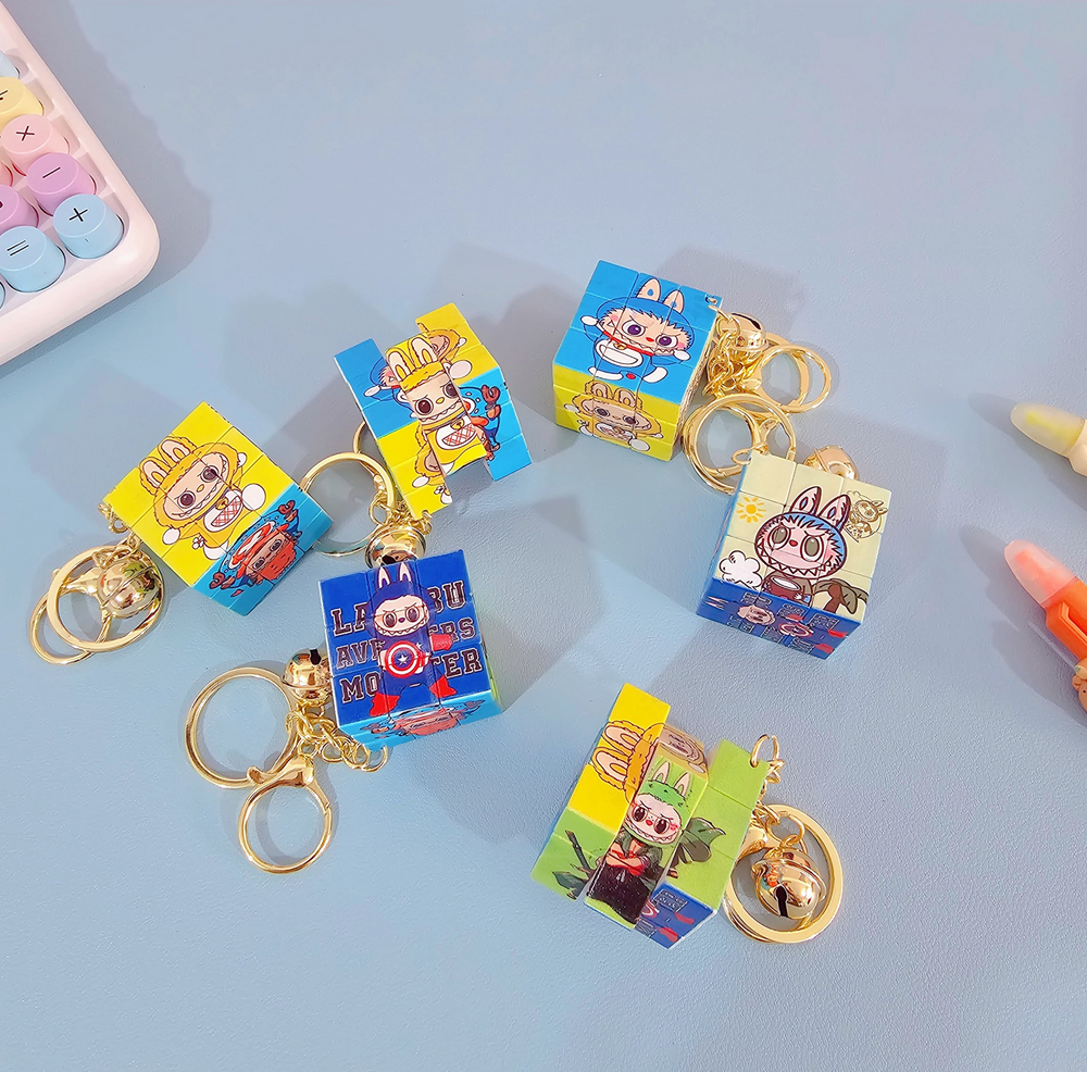 (Llavero en forma de cubo "labubu" en el cual cada cara representa un personaje diferente. Además de un llavero puede servir para un entretenimiento. Trae su aro metálico dorado para poder colocarlo en tus llaves).