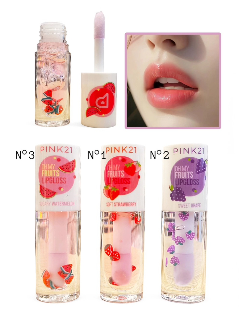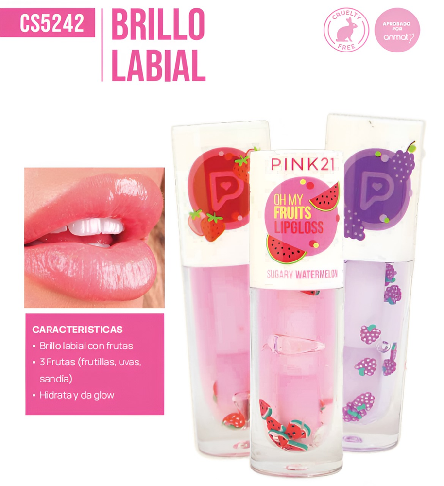(Brillo labial marca "Pink 21" . Vienen 3 modelos diferentes a elección. Ideal para darle brillo a tus labios y un sabor riquísimo, dejandolos con un look natural).