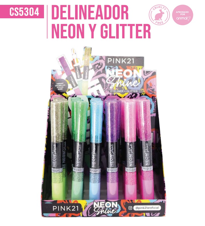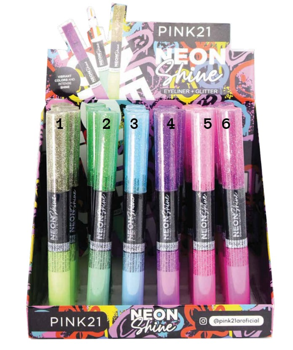 ( Caja x24u de Delineador Neon y Glitter "Pink 21", es 2 en uno, contiene de un lado glitter y del otro lado color, también sus piezas cuentan con una capacidad de 4ml. Tiene 6 colores diferentes. Ideal para salir a fiestas y que no te pueda faltar en tus maquillajes).