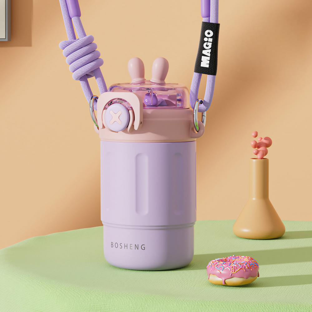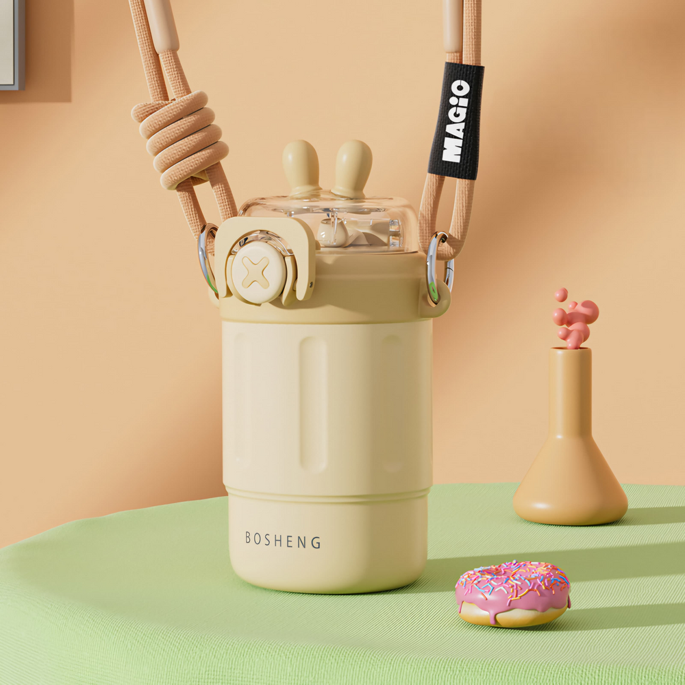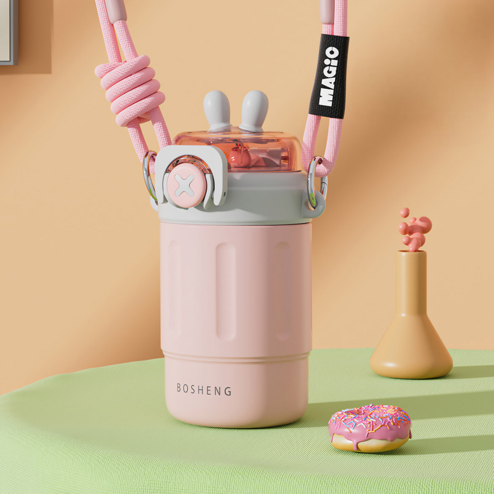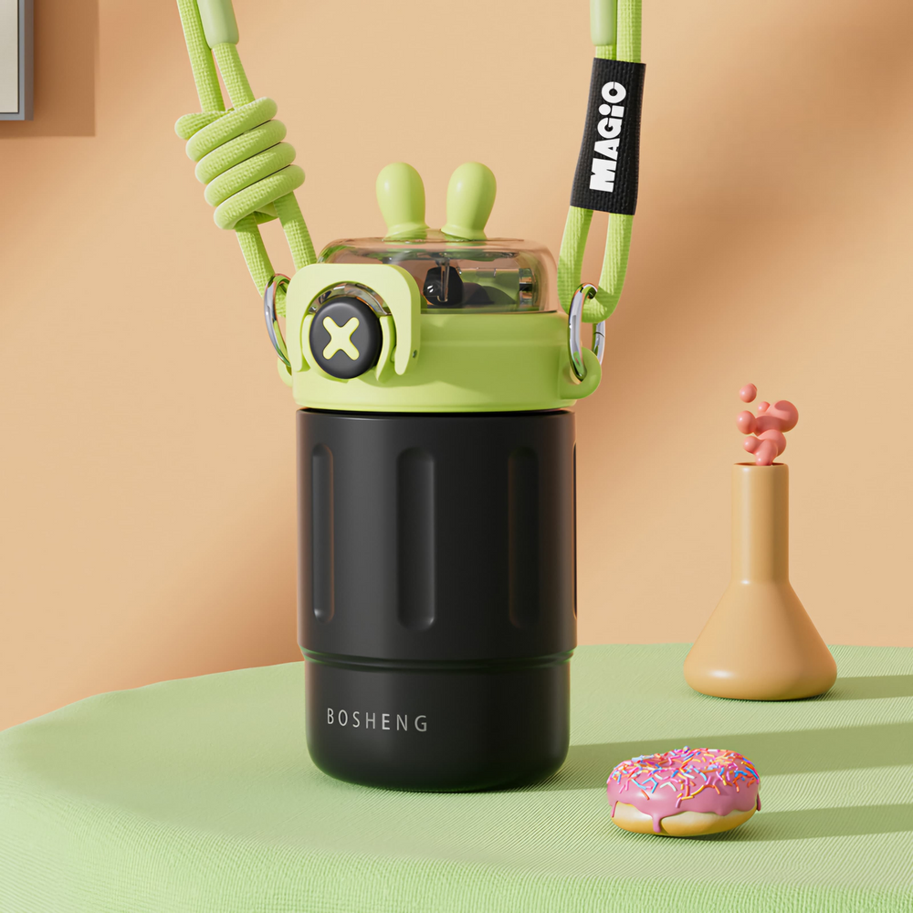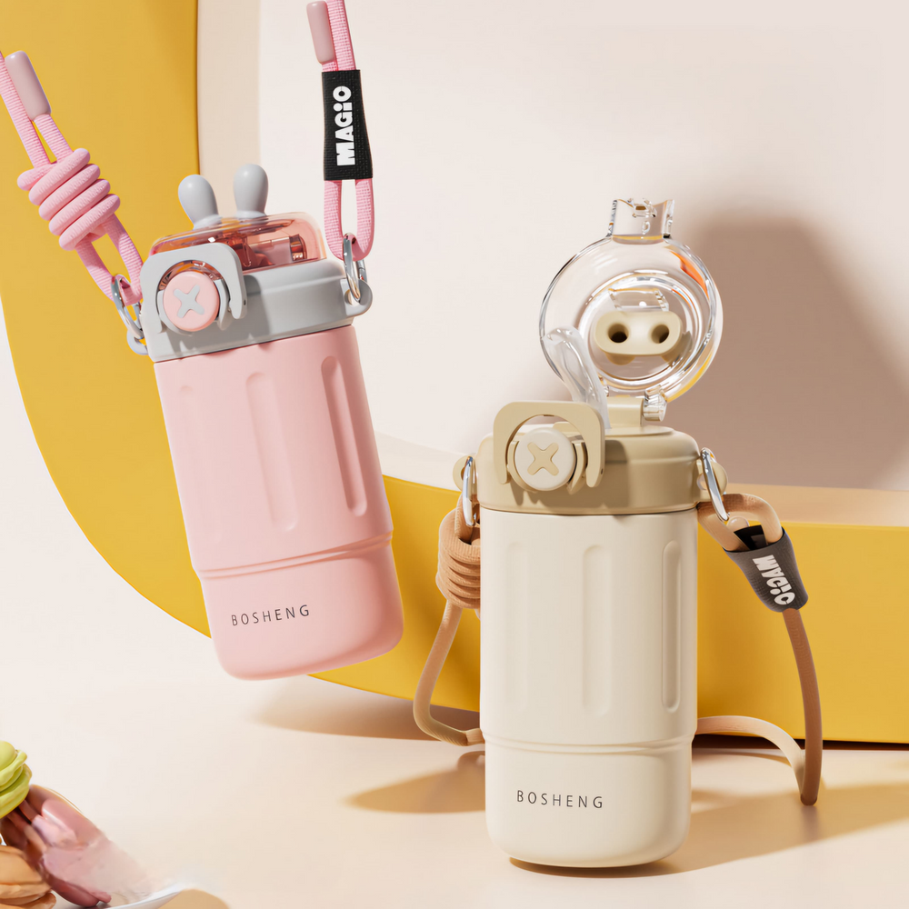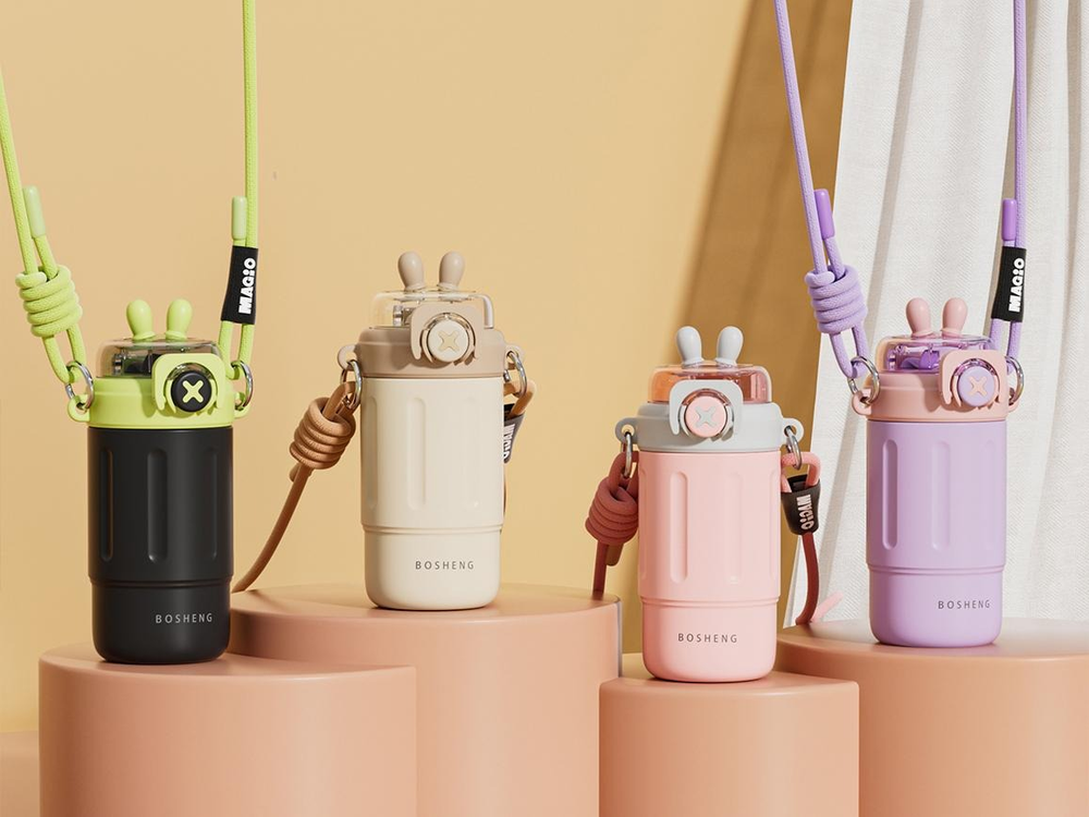 (Botella térmica de 300ml de acero inoxidable, viene con un pico y sorbete, especial para colocar tus bebidas frías o calientes, de larga duración. Vienen 4 opciones. Cuenta también con su correa para poder llevarla fácilmente donde quieras).
