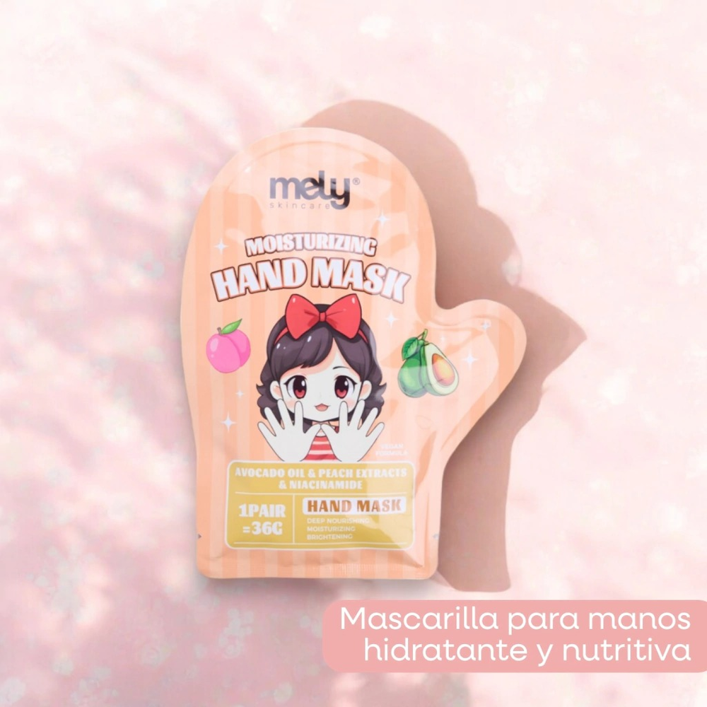 (Mascarilla para Manos de Durazno "Mely". Esta mascarilla contiene aceite de avocado, durazno, niacinamida. Ideal para que nutra la piel, reduzca la apariencia de manchas y muchos beneficios más).
