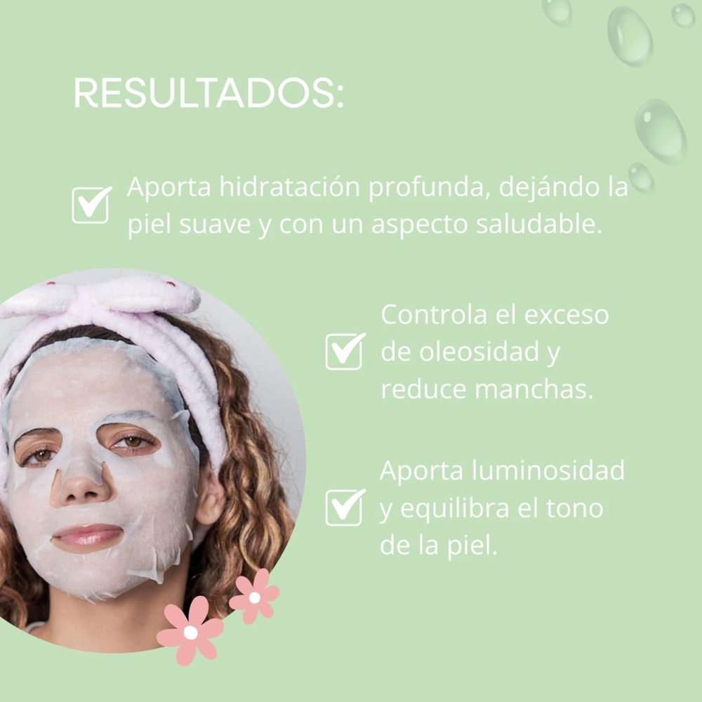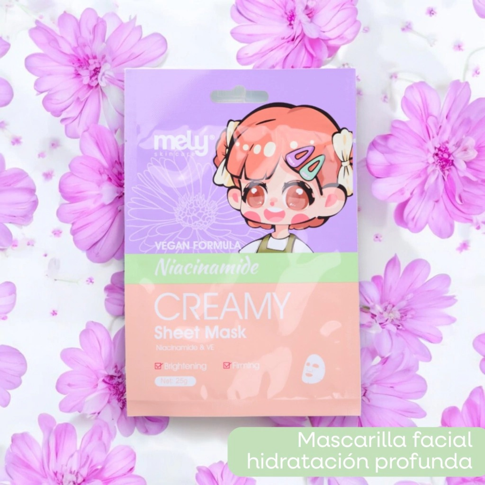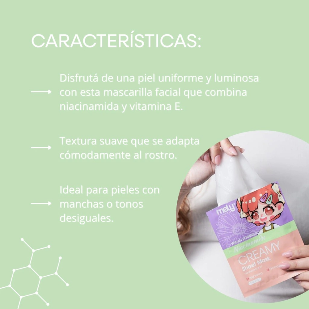 (Mascarilla hidratante que contiene vitamina e y niacinamida, permitiendo dejar tu piel hidratada, reduce manchas, deja tu piel suave y brillosa y muchos beneficios más).