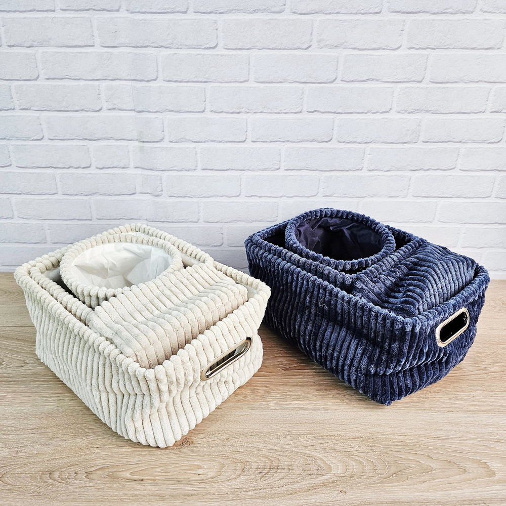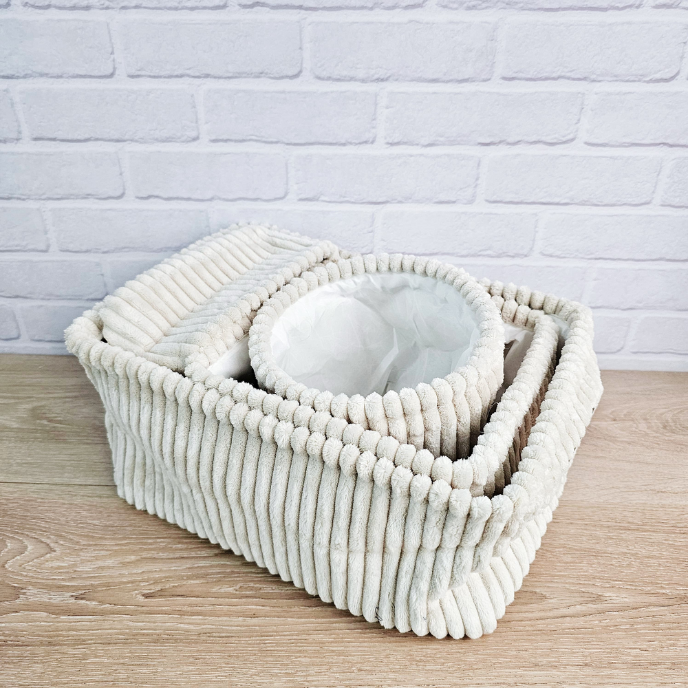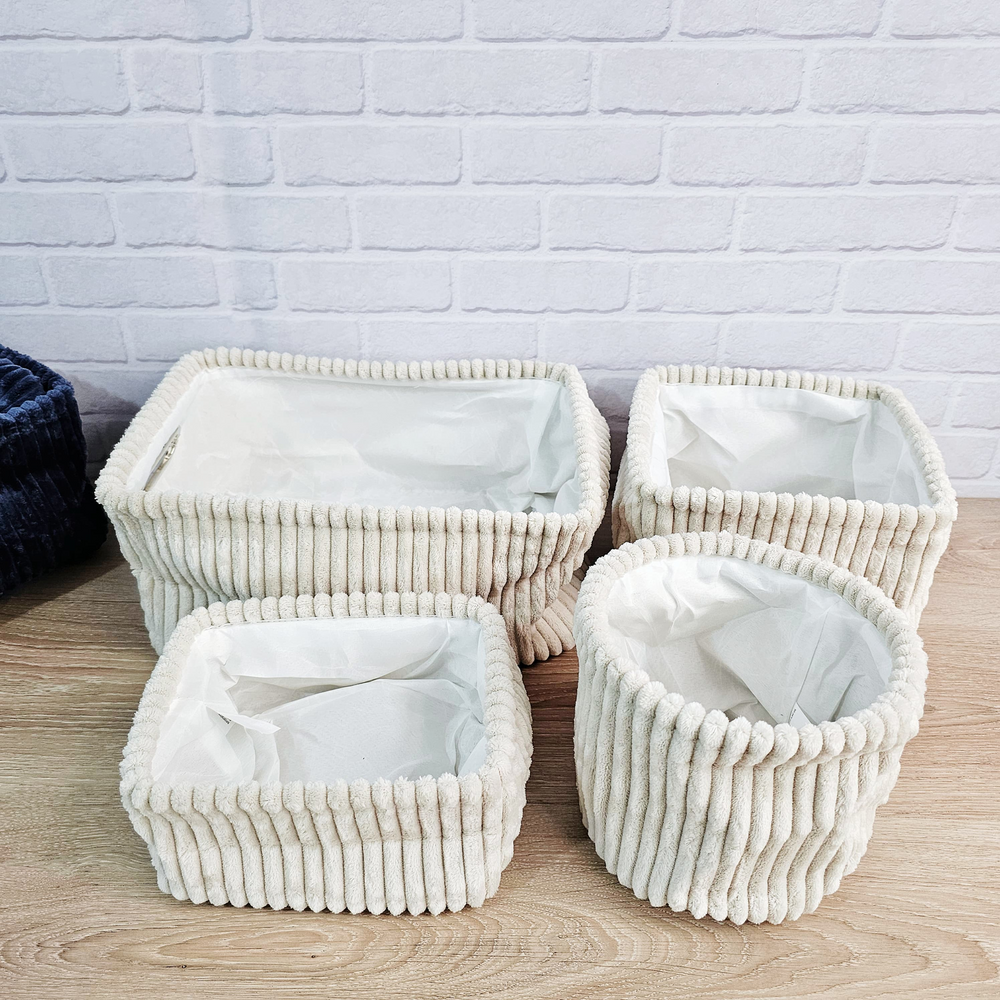 (Set x 4U. Organizadores multiuso en diferentes tamaños, tela suave y delicada, disponible en dos colores. Ideal para tu hogar). Grande: Largo: 34cm x Ancho: 23cm x Alto: 17cm Aprox. Mediano: Largo: 21cm x Ancho: 21cm x Alto: 17cm Aprox. Chico redondo: Diametro: 17cm x Alto: 15,5cm Aprox, Chico: Largo: 20cm x Ancho: 15cm x Alto: 11cm Aprox.