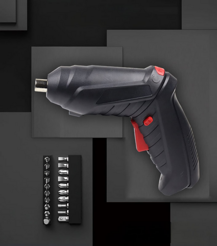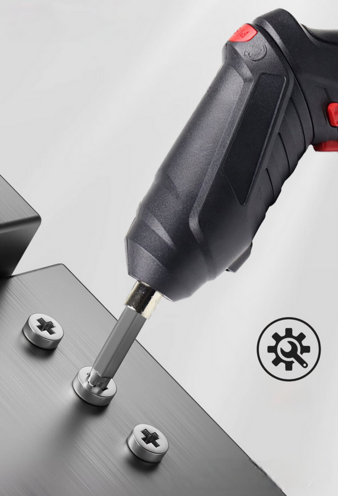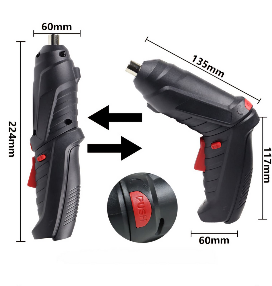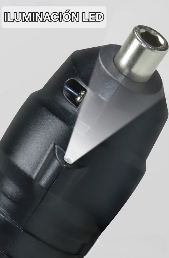 (Destornillador Eléctrico Recargable con 10 cabezales. Luz led Incorporada, el mango se puede ajustar de 90 a 180 grados, botón de avance y retroceso, recargable con carga USB. Potencia 4.2V, velocidad 250rpm).