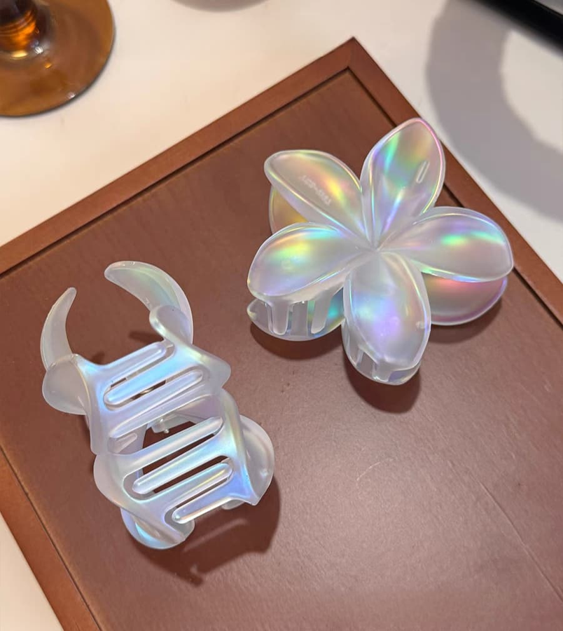 (Pack x 12 hebillas con forma de flor blanco tornasolado y transparente tornasolado. Ideal para usar en cualquier evento o simplemente levantar tu look del día).