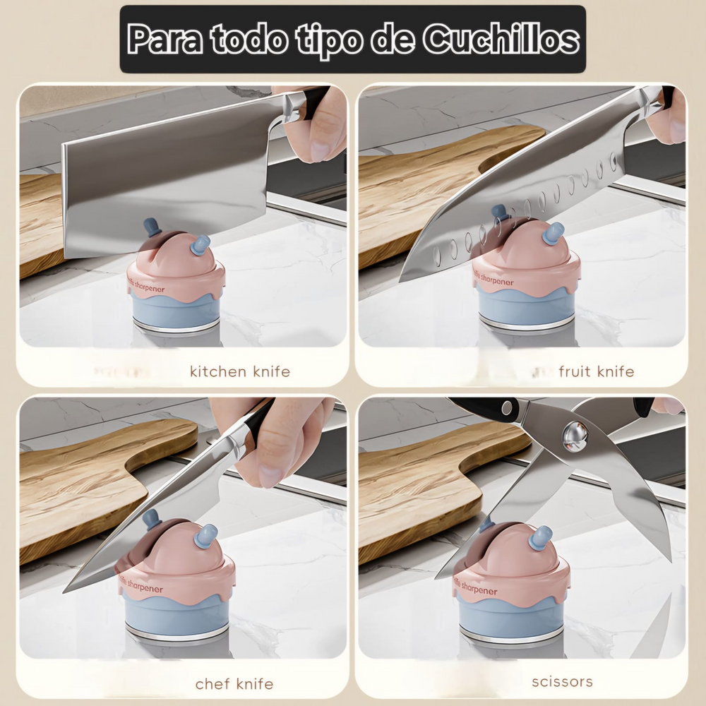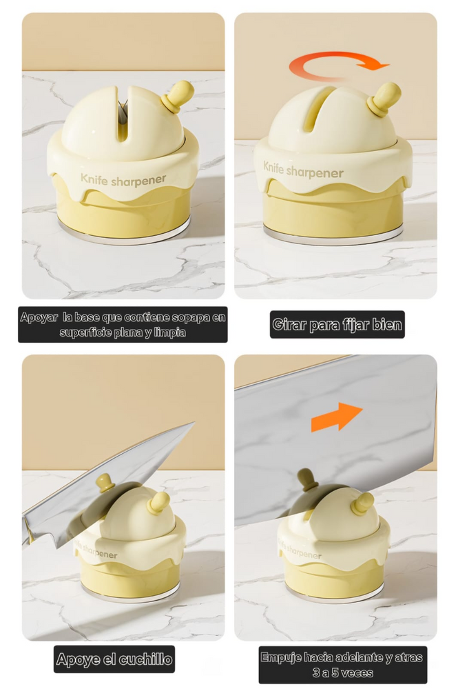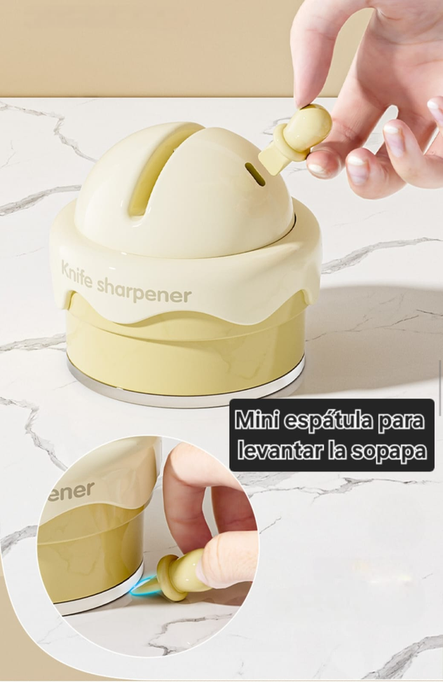 (Afilador de cuchillos. Afila con máxima efectividad toda clase de cuchillos. Cuenta con una sopapa en la parte inferior que la girar absorbe y fija en la superficie lisa. La misma cuenta con una mini espátula para facilitar levantar la sopapa. Muy cómodo y práctico de usar).