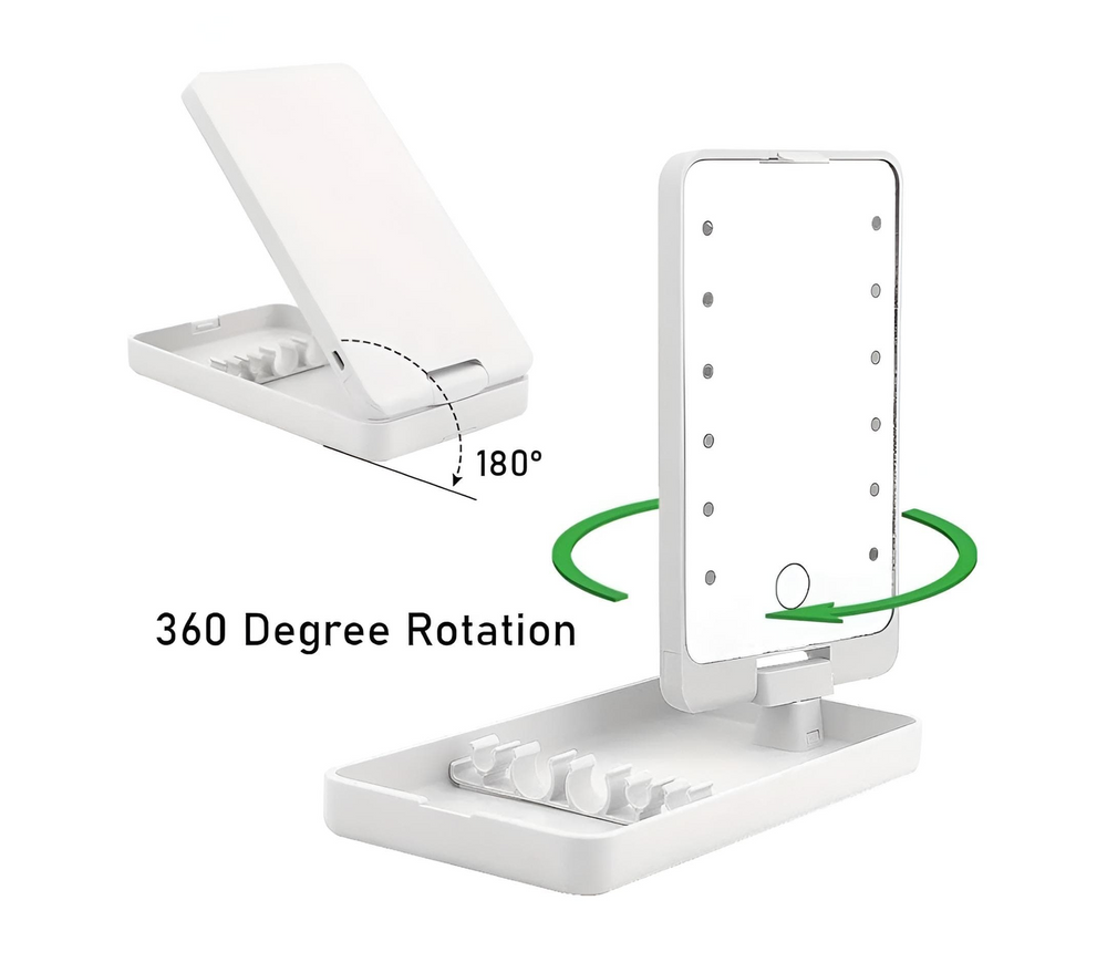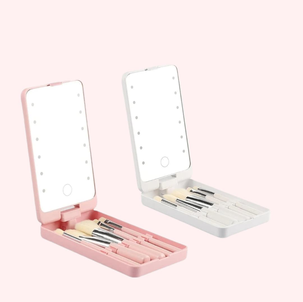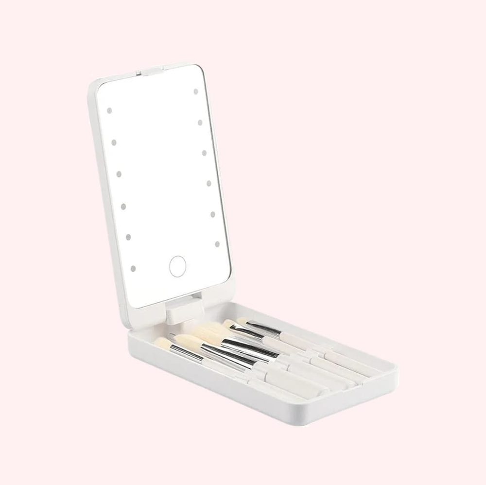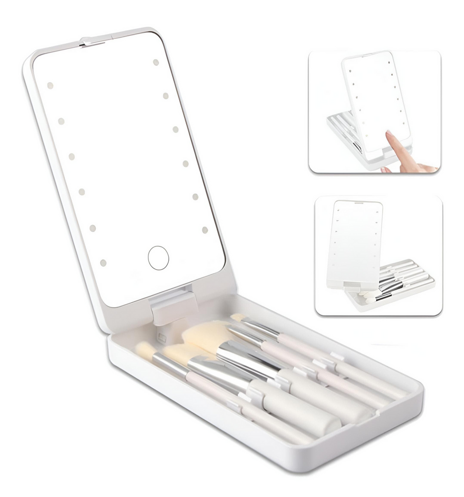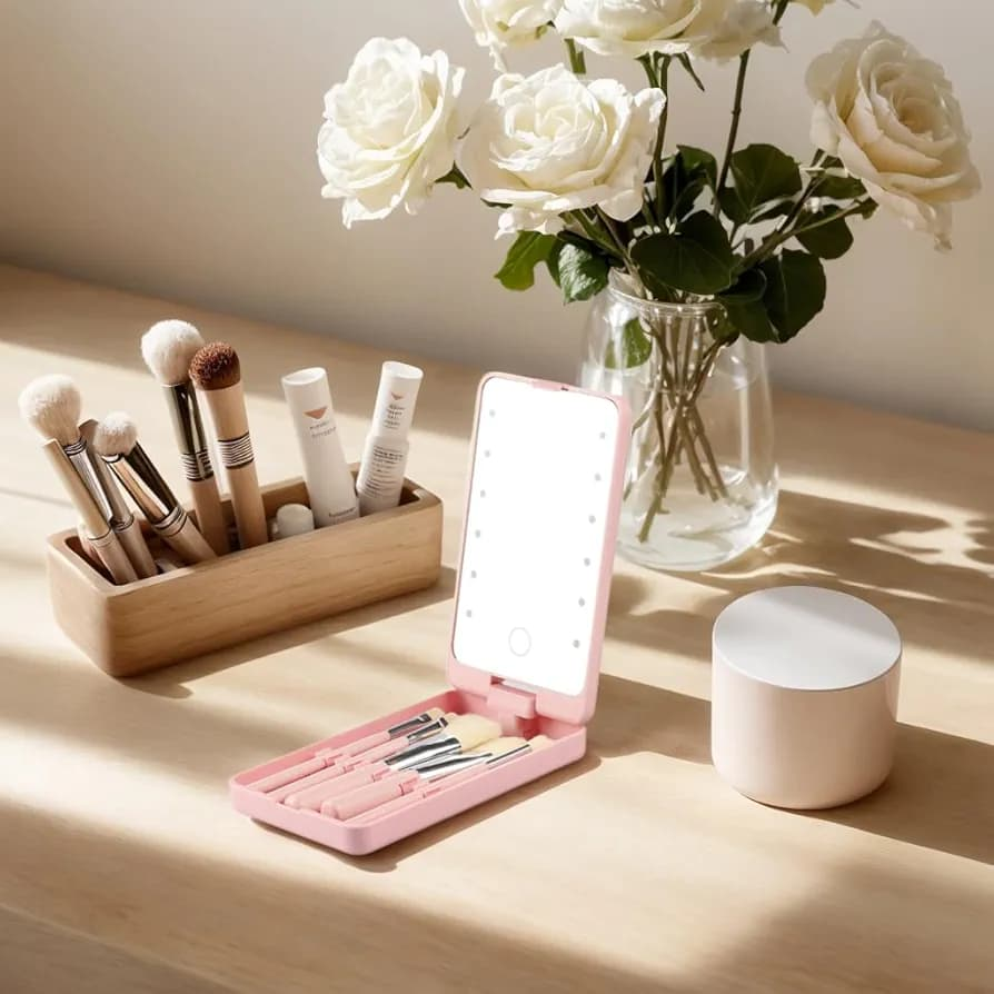 (Organizador de brochas con espejo, este cuenta con cargador USB, ya que tiene luces a su alrededor, también puede girarse a 360°. Ideal para poder llevarlo donde quieras y retocar tu maquillaje. Cuenta con dos opcione diferentes).