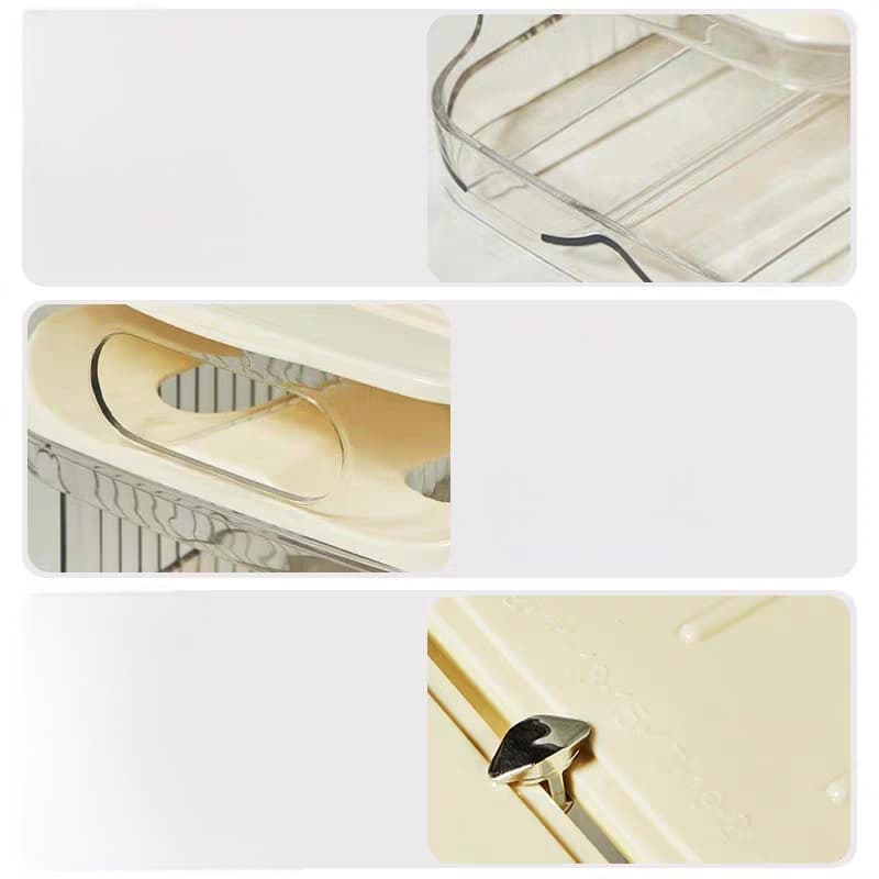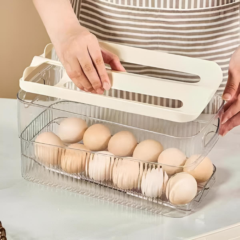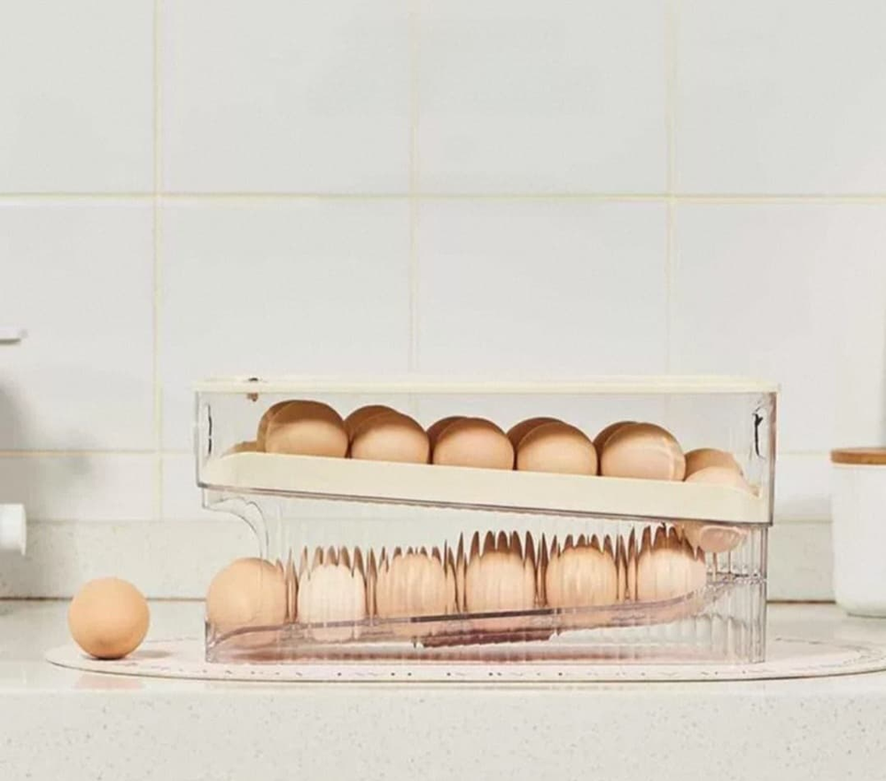 (Cuenta con 2 niveles de almacenamiento y un diseño inclinado lo que permite que los huevos se deslicen y ocupen los huecos vacíos. Ideal para obtener más espacio en tu cocina).