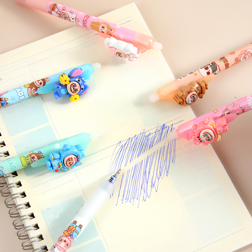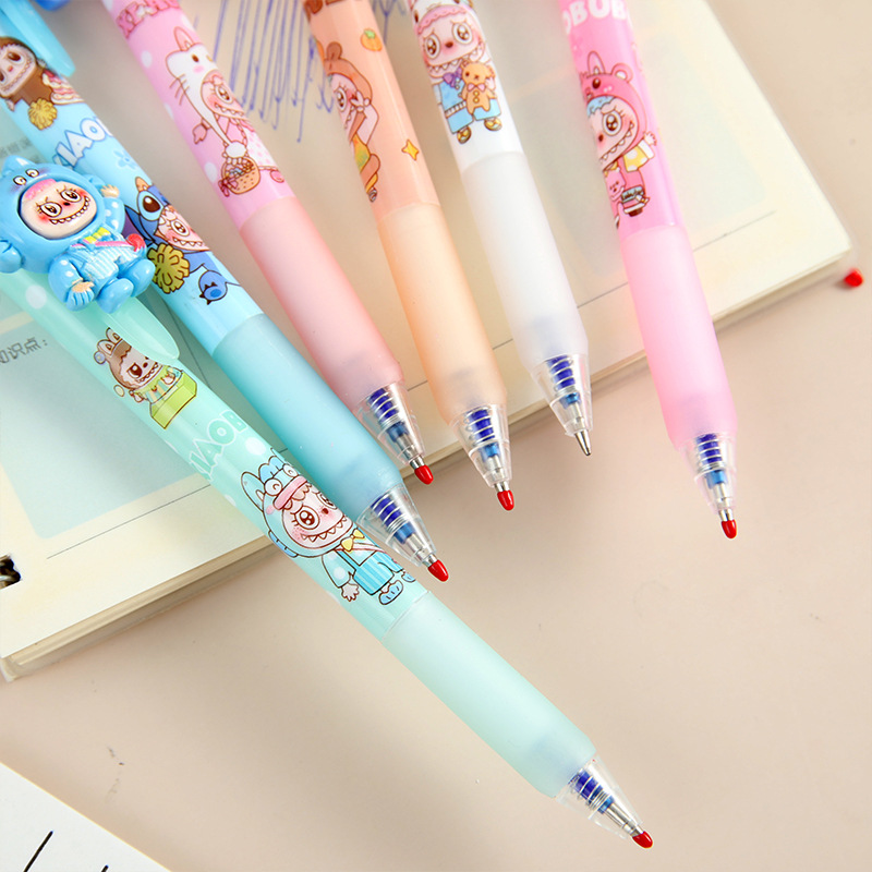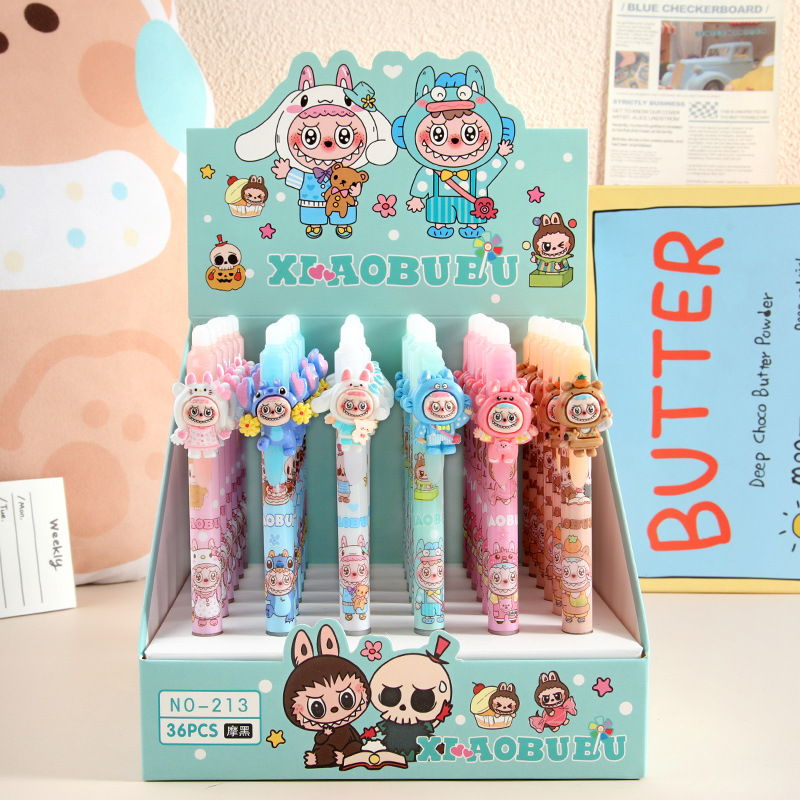 (Caja x 36U. de birome labubu en diferentes diseños , cuenta con un mecanismo retráctil. ideal para poder regalar, llevar al colegio, etc. En una de sus puntas cuenta con un muñequito de labubu).