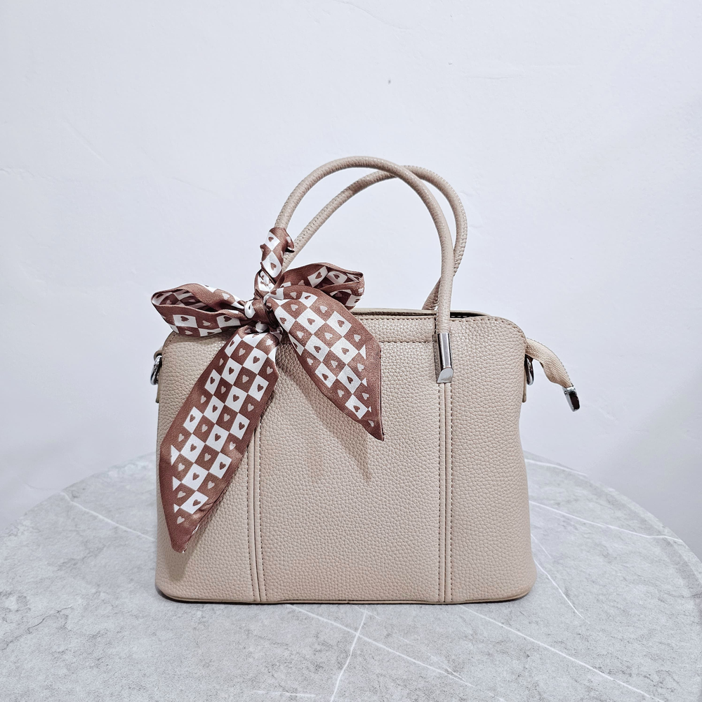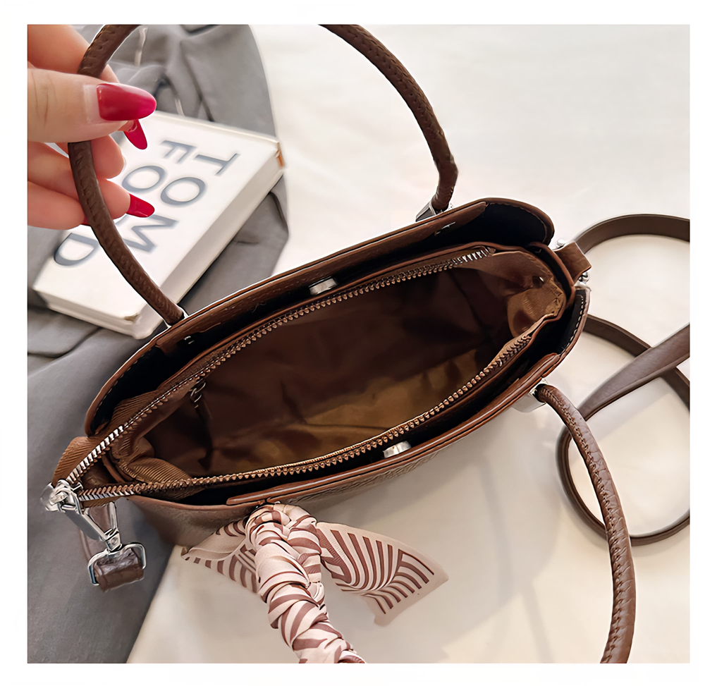 (Cartera de mano disponible en 2 tonos diferentes a elección. Cuenta con una correa ajustable y también un pañuelo para usarla como más te guste. En su interior cuenta con un compartimiento con cierre. Su diseño compacto la hace perfecta tanto para salidas casuales como para eventos especiales, combinando practicidad y elegancia en un solo accesorio).