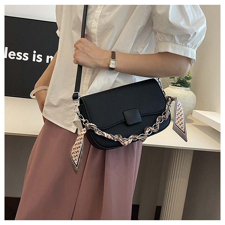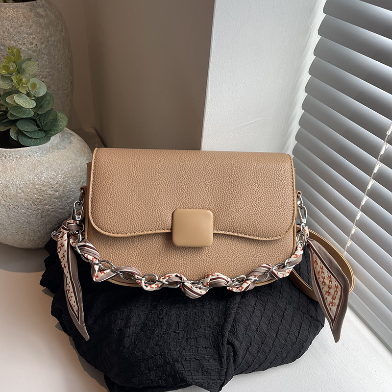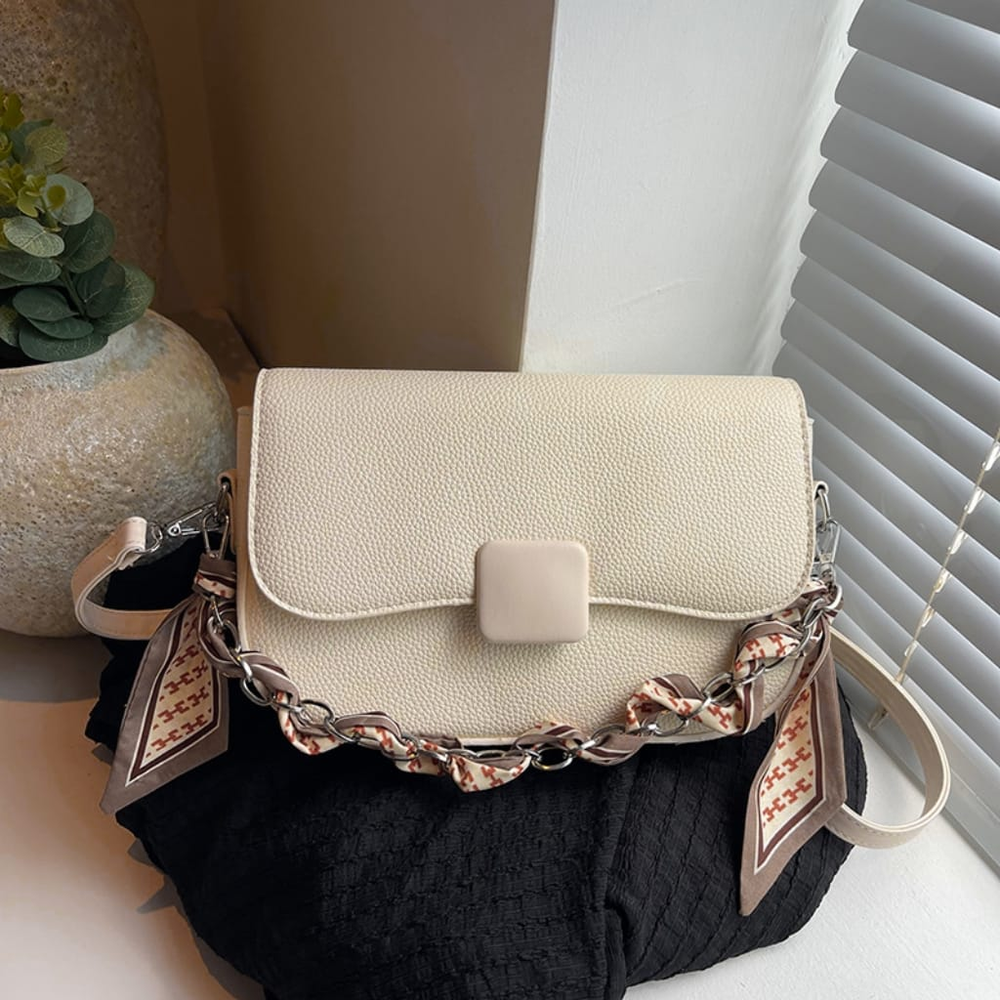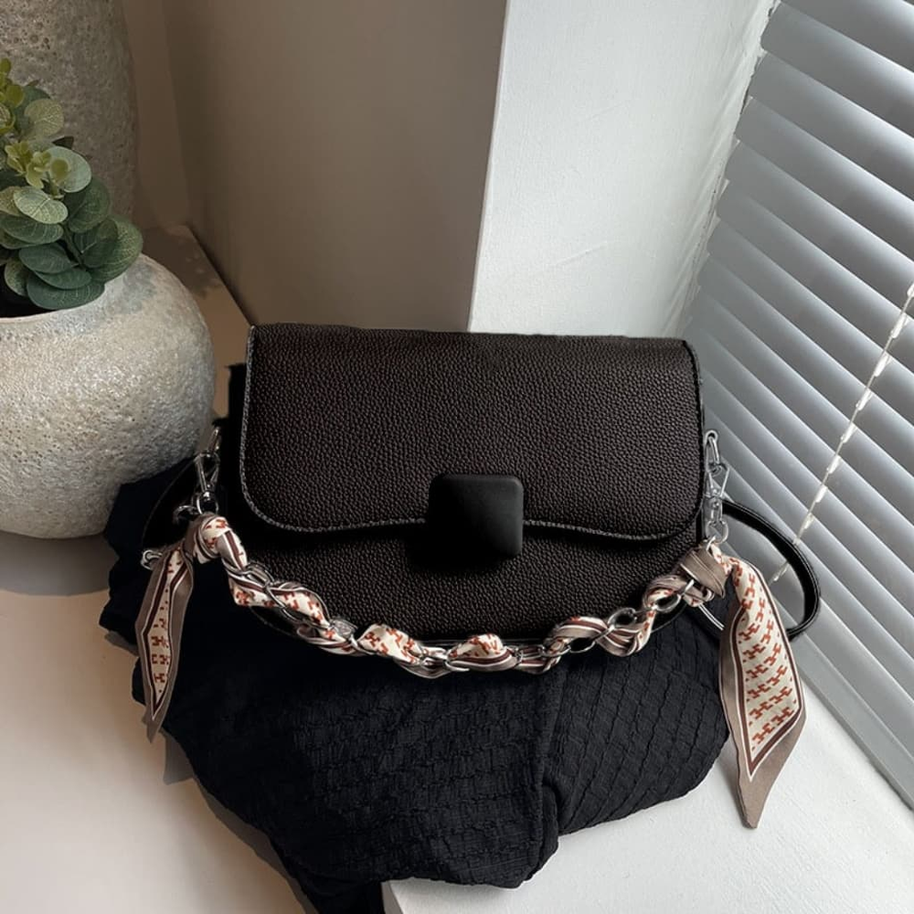(Cartera chica disponible en 3 tonos diferentes a elección. Cuenta con una cadena metálica super canchera y una correa ajustable que la transforma en una bandolera. En su interior cuenta con un compartimiento con cierre. Su diseño compacto la hace perfecta tanto para salidas casuales como para eventos especiales, combinando practicidad y elegancia en un solo accesorio). NO INCLUYE PAÑUELO, IMÁGEN ILUSTRATIVA