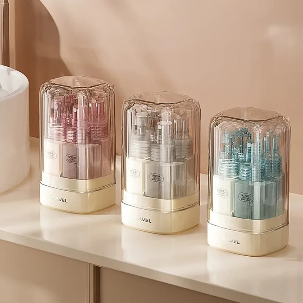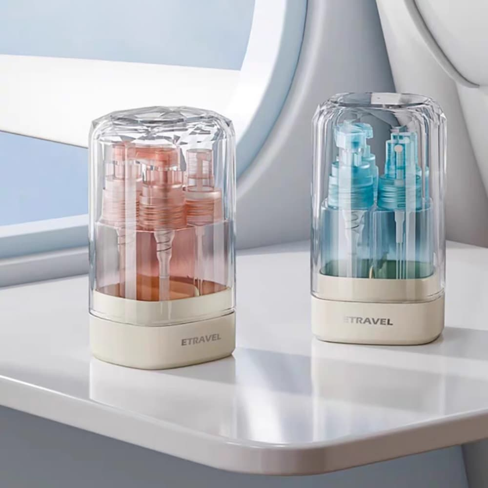 (Set x 4U. Neceser de Viaje. Contiene 2 rociadores y 2 dispenser, para que nunca falten en tus viajes, ideales para colocarle, jabón, alcohol, shampoo, acondicionador. Los 4 envases vienen en un neceser, ideal para que no te ocupe mucho espacio. Cuenta con 3 opciones diferentes).