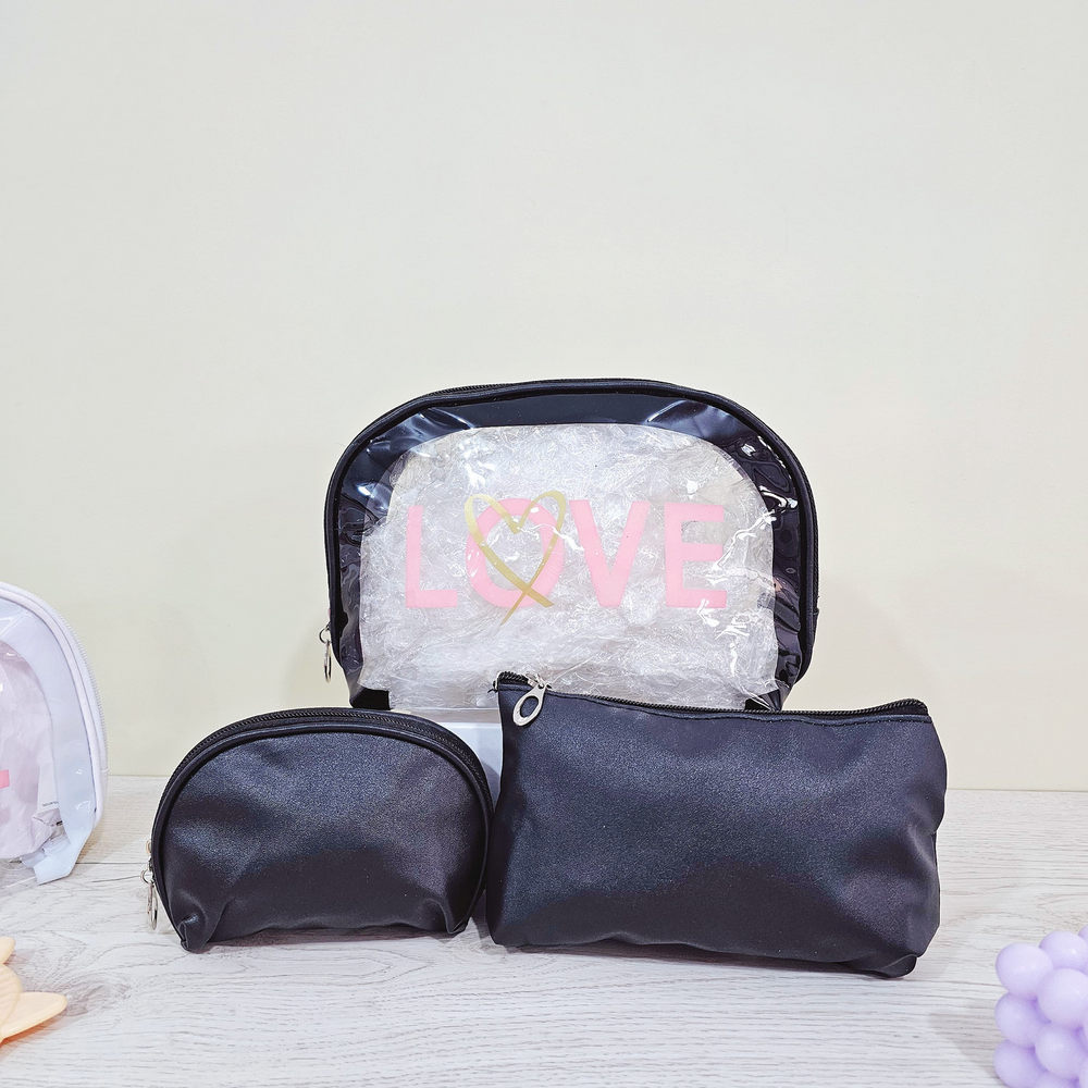 (Set de portacosméticos, vienen tres de diferentes tamaños. Ideales para darles el uso que gustes. Disponible en 2 colores). Grande: Largo: 16cm x Ancho: 26cm Aprox. Mediano: Largo: 13cm x Ancho: 20cm Aprox. Chico: Largo: 12cm x Ancho: 15cm Aprox,