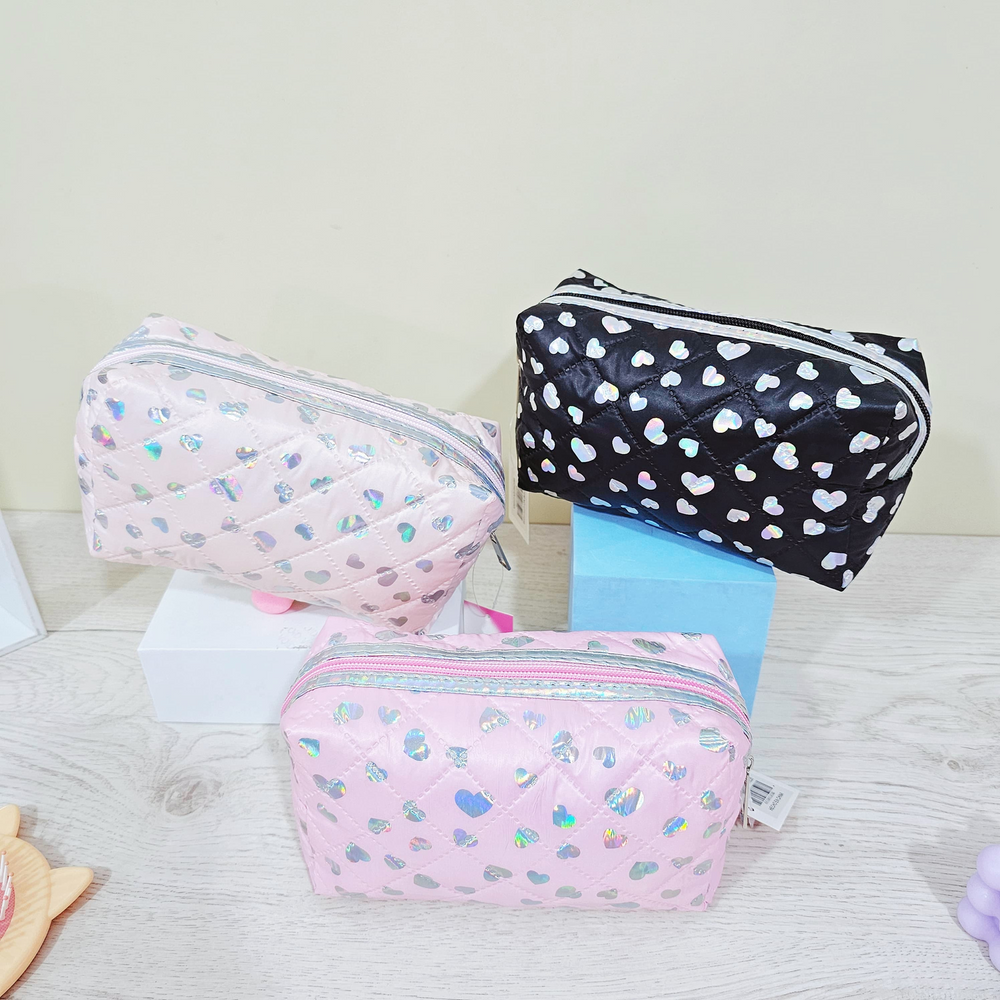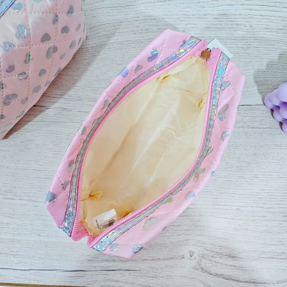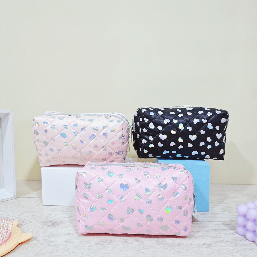 (Portacosmetico con relieves y corazones plateados holográficos. Cuenta con 3 opciones diferentes, ideales para guardar tu maquillaje. Su tamaño permite no ocupar mucho espacio y dejar todo en orden).